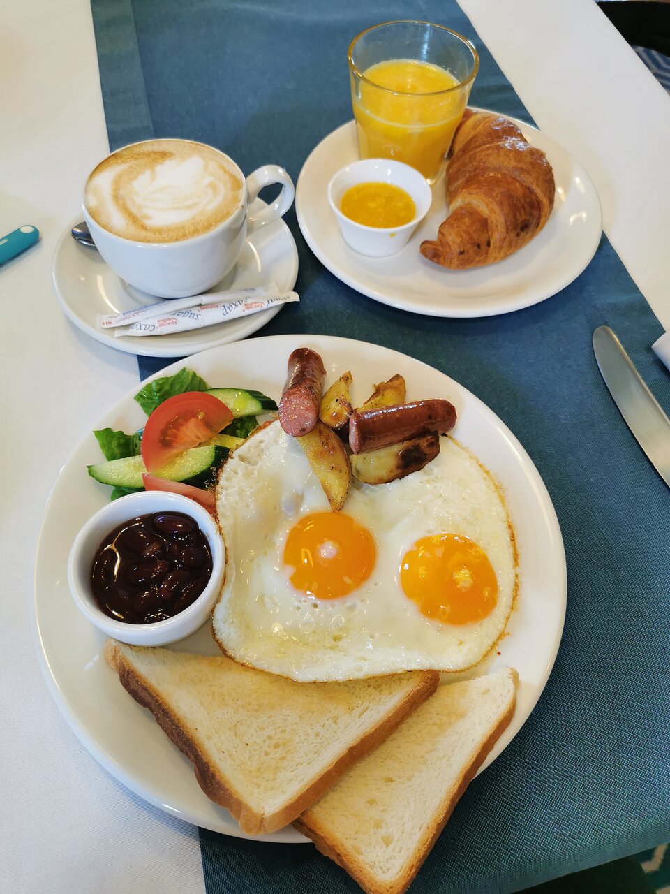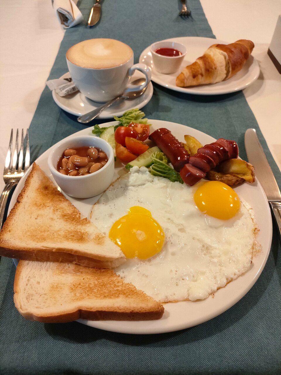 Еда — отлично, завтраки разные, на любой вкус и цвет: каши, блюда из яиц разные, сырныки, для особо голодных — английский завтрак, где большое разнообразие. Номера — разные, по бюджету — все как и везде, оьслуживание-хорошее, не пересекался с персоналом, ни утром не вечером; расположение — центр города, рядом магазины, продуктовые, шопинг, есть ТЦ, персонал вежливый, приветливый, парковка — небольшая, внутренняя территория, шлагбаум; напитки — кулер с водой на этаже