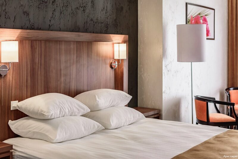 Были в Аристократе 1 сутки.приехали за час до заселения.Нас заселили раньше.так как наш забронированы номер был занят,предложили другой номер повыше уровнем.в номере шкаф,сейф,чайно-кофейный набор,чашки,халаты,тапочки,полотенца.чистая душевая со свежим ремонтом.в бассейне,кроме нас был 1 человек.бассейн тёплый,сауна и хамам жаркие. Подкачали завтраки-никаких элементов шведского стола,на выбор 2 позиции горячего,кексы и по 1 чашке чая или кофе на выбор из пакетиков,что мне,как кофеману странно.у отеля небольшая территория.можно прогуляться по деревне.рчжом храм,конный двор.