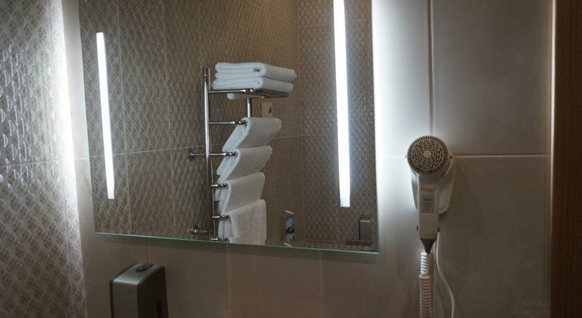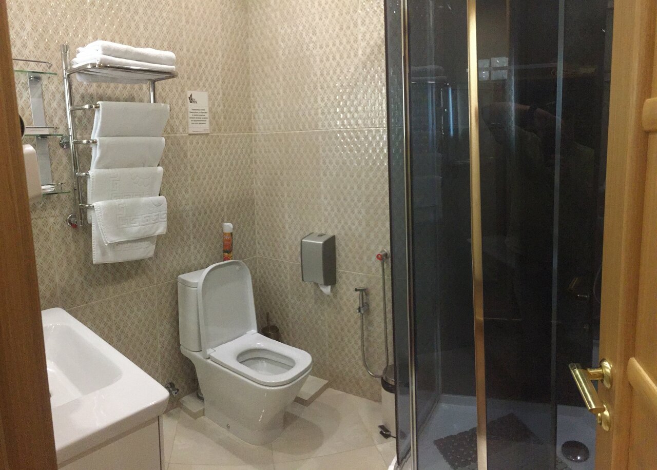 - В ванной есть всё необходимое.; Наличие халатов и тапок.; Большие порции.; Быстрое обслуживание.; Хороший ресторан и кафе при гостинице.