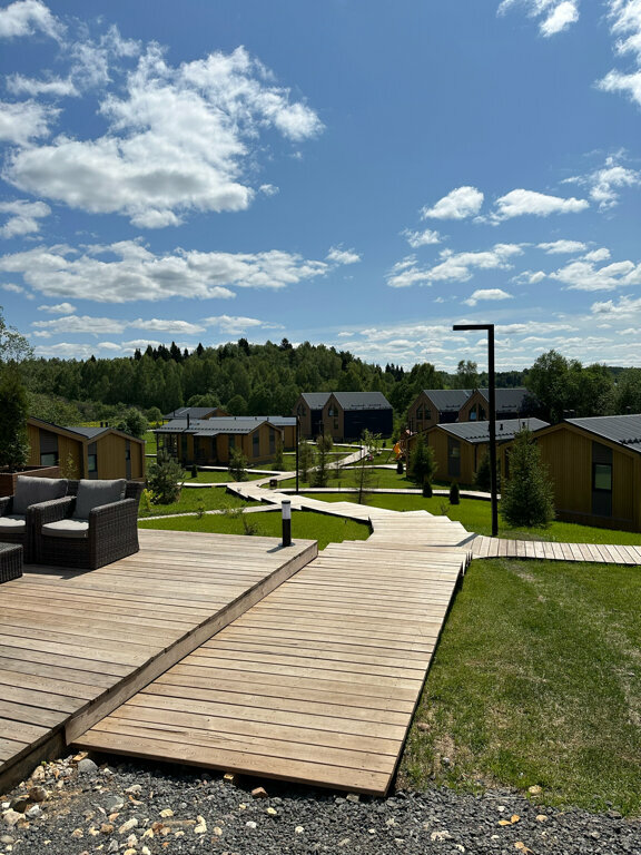 Отличное обслуживание. Дома комфортные. Но негде гулять. Небольшая площадка вдоль маленькой речушки. Отличный вариант дома с горячей купелью на веранде, это замечательно.