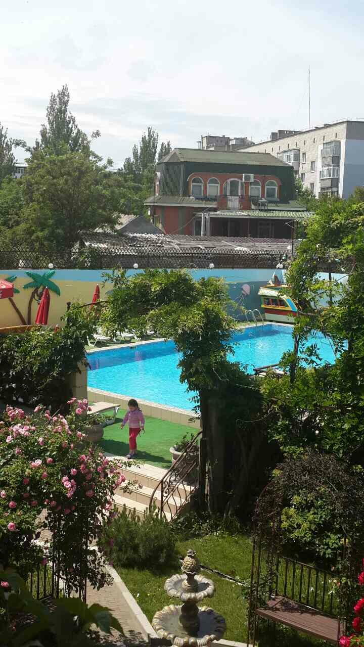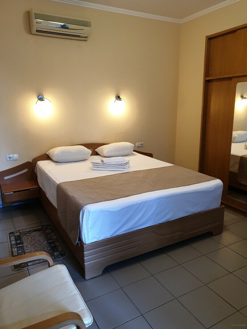 Останавливались на сутки ,были проездом в Бердянске. 2500 номер стандарт. Есть своя стоянка.это уже плюс. Номер простенький, маленький плоский телевизор ( каналы не работали), полотенца белые нормальные, матрас неудобный, мебель простенькая, дверца шкафа еле открывалась. Нет стульев, но стол есть. Чайник и две кружки. Можно было бы и чайные ложки положить . Просто из отелей и гостиниц Бердянска это более приличная. Напротив универмаг. Близко к морю. Ненадолго остановиться можно