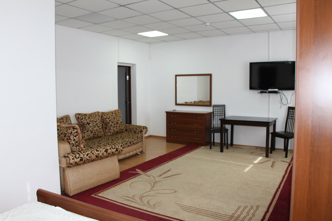 Останавливались на одну ночь. Персонал отзывчивый. Кровать удобная, постельное белье, полотенца, халат, все идеально чистое, без пяти и дыр. Санузел просторный, все чисто. Наш номер был очень большой, в нем есть диван, телевизор, кондиционер, шкаф большой и комод, а так же чайник, что очень оценили мы в этой поездке, залили термос в дорогу. Рекомендуем.