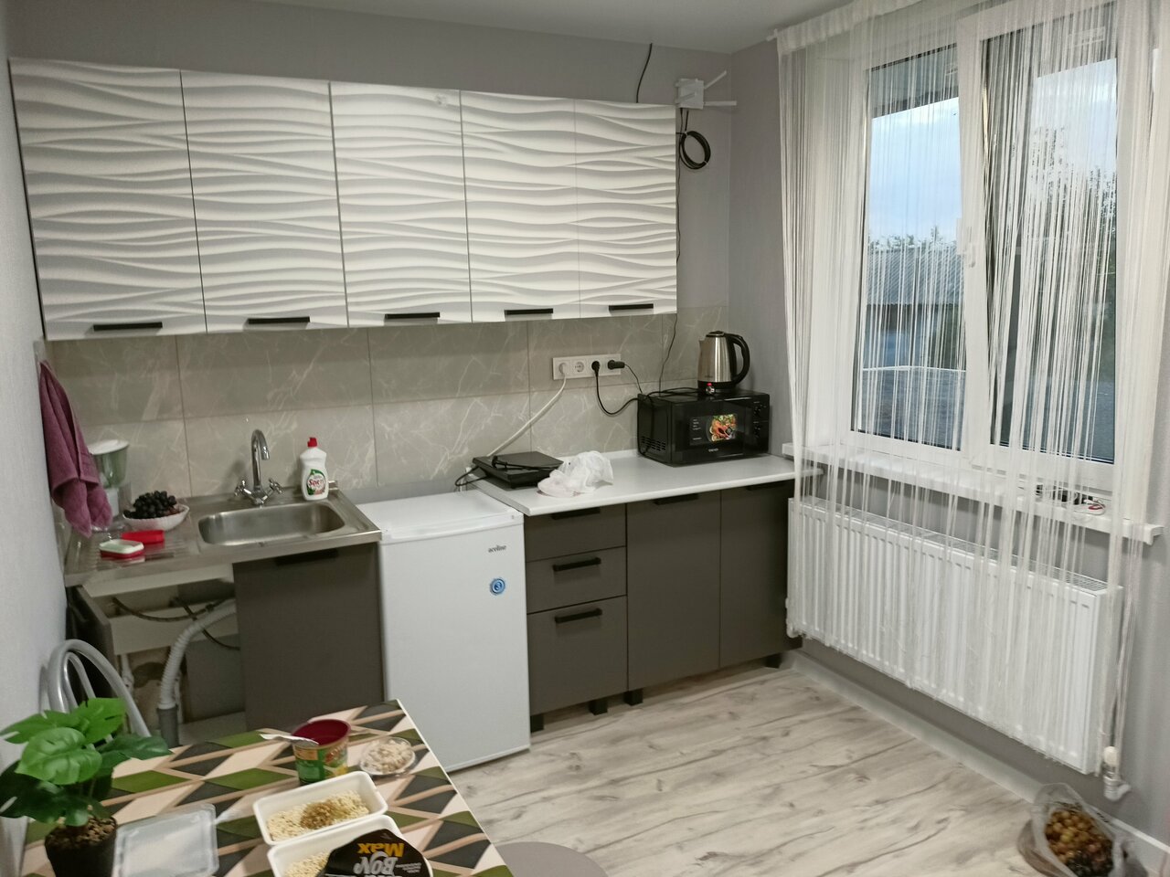 Отлично разместились, в номере очень чисто, есть всё для приготовления еды — плита, посуда, микроволновка, чайник, сковорода. Рекомендую однозначно!
