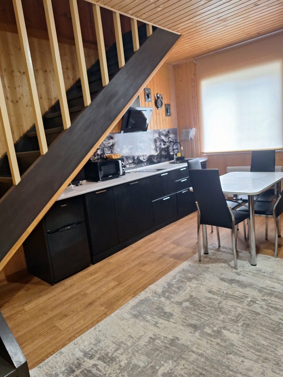 Чисто, кухня все есть, туалет, душ, комната огромная и бесконтактное заселение, тачку бросили во дворе у входа в дом. Есть мангальная зона, жаль нашли только утром, щель между домом и гаражом)
