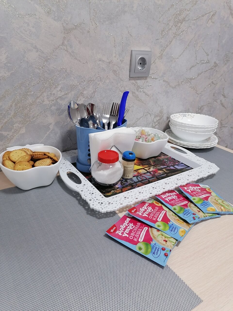Чисто, красиво, всё новое, но шумоизоляция плохая — соседей слышно. От трассы норм не далеко. Есть завтрак — каши какие-то заварным чай, посуда.