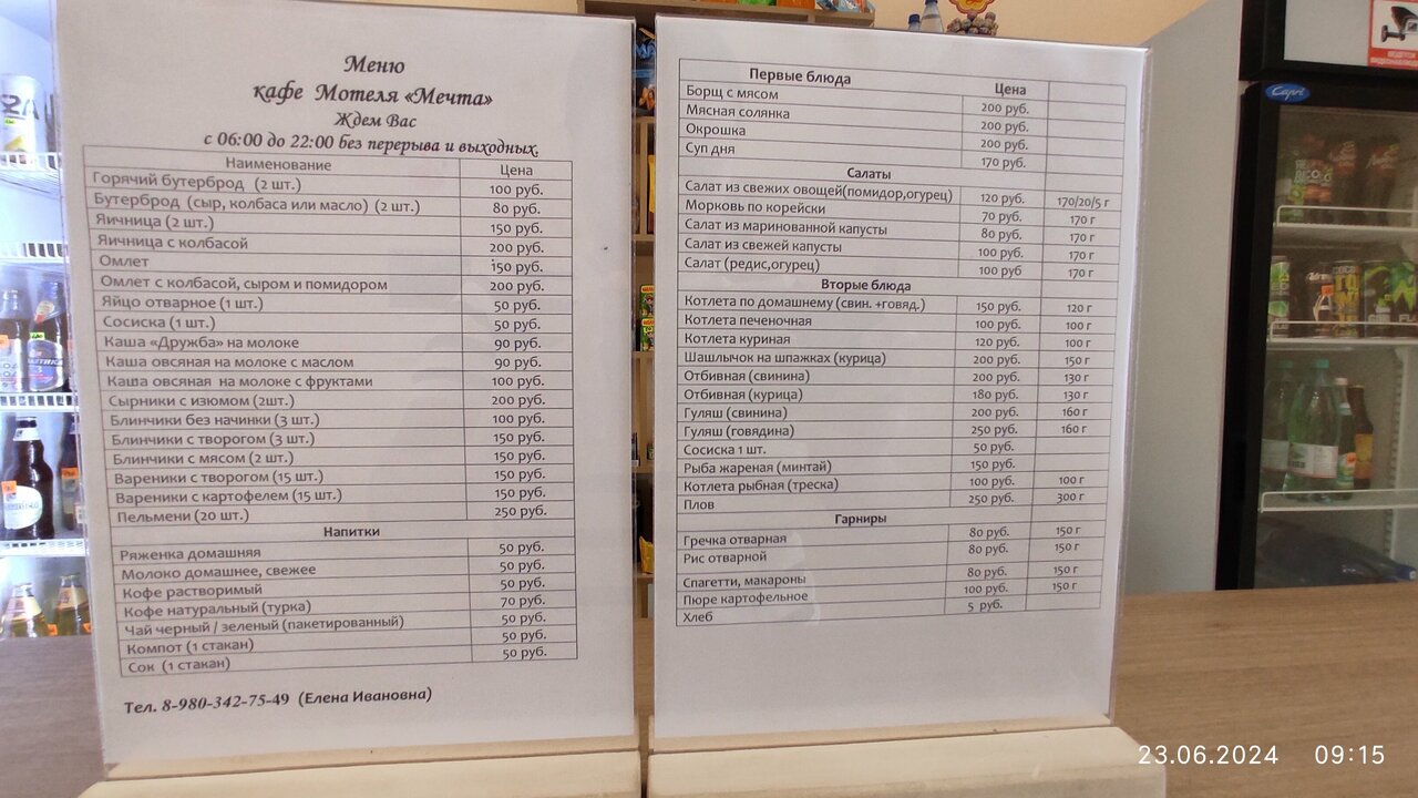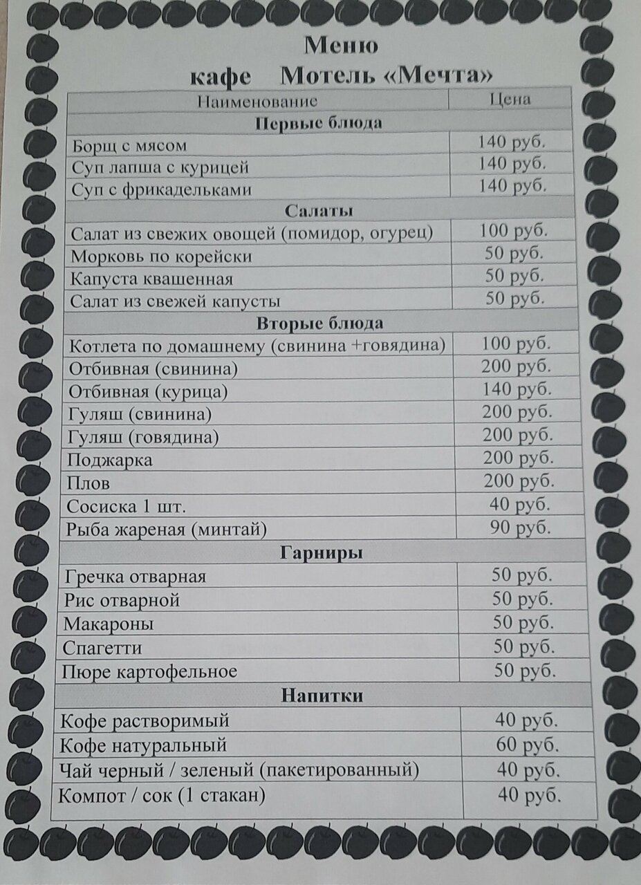 Были с мужем проездом в вашем городе. Остановили выбор на мотеле Мечта. Недалеко от дороги, можно быстро отправиться в путь после отдыха. В номере чисто и не жарко, свежая постель и тишина. Поужинать решили в кафе при гостинице. Очень удивили демократичные цены! Особенно порадовал приветливый персонал,белая чистая форма и бейджики (у нас пунктик, всегда смотрим на внешний вид). Заказали гречку с гуляшом. Это просто сказка! Никогда не думала, что гречка может быть такой вкусной в кафе! Будто мама приготовила. Порции большие, муж наелся) Очень хочется поблагодарить Светлану Владимировну и Людмилу Николаевну за их труд! На обратном пути обязательно заедем снова)