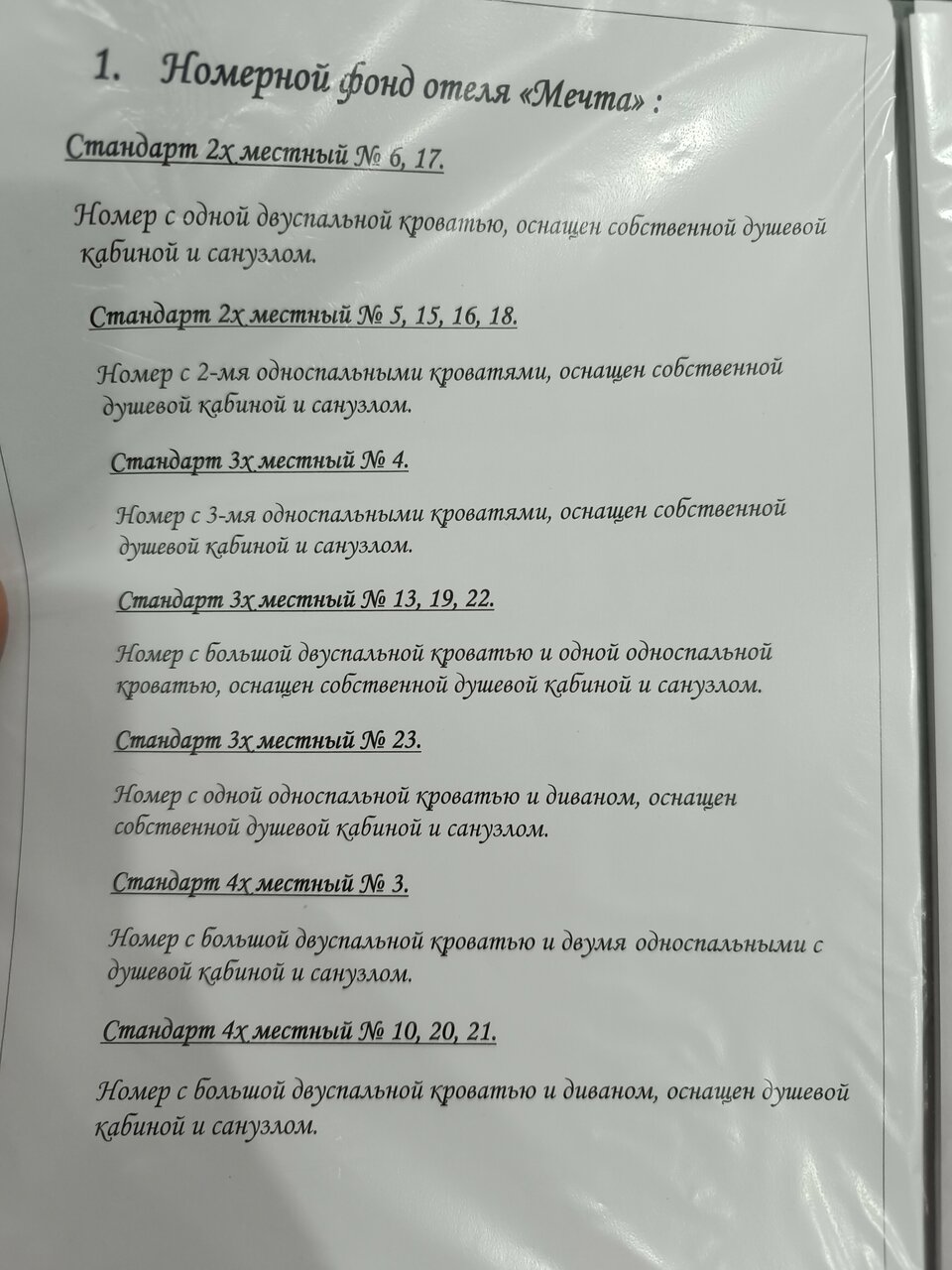 Отель ‘Мечта’ замечательный. Чистенький, уютный, номера с иголочки. Готовят кушать для посетителей сами: завтрак, обед, ужин. В любое удобное время. Цены приемлимые. Рекомендую всем. Спасибо Наталье.