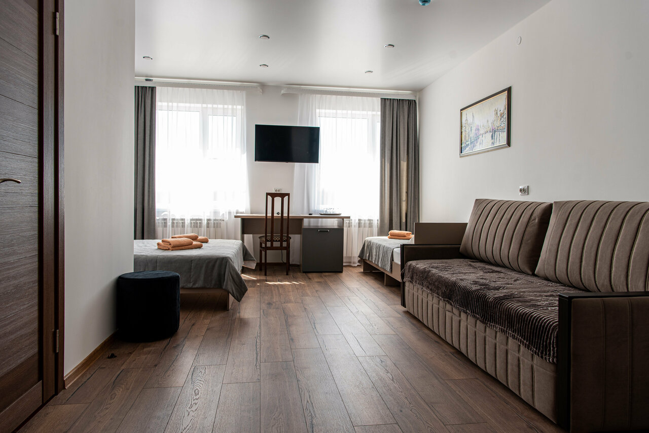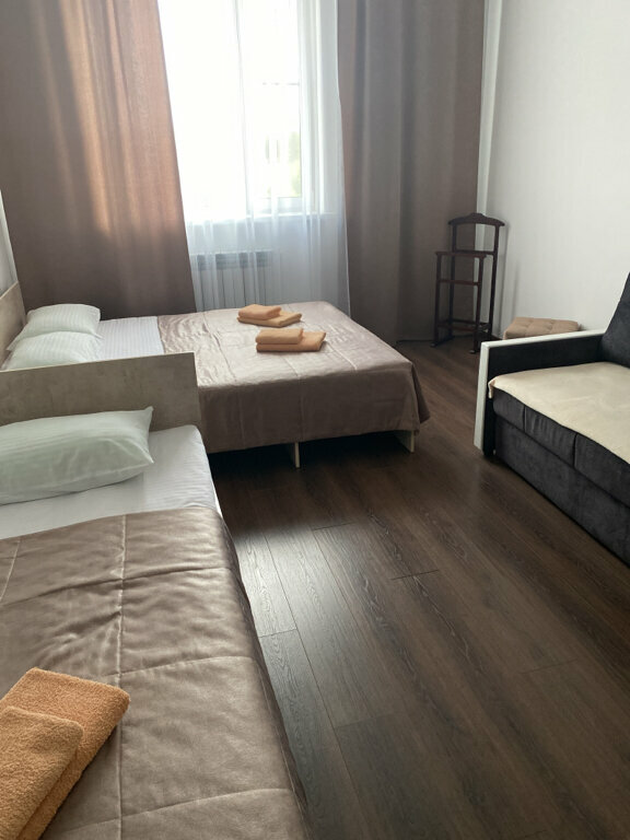 В наличии имеются два вида четырехместных номеров: номер с двуспальной кроватью и раскладным диваном, а так же номер с двуспальной кроватью и двумя односпальными кроватями. В номере могут разместится от 1-го до 4-х человек. Номера оснащены душевой...