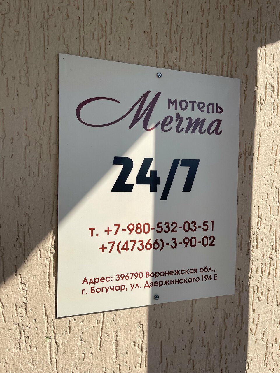 Гостиница «Мечта» (Богучар, ул. Дзержинского, 194Е) — современная двухзвёздочная гостиница, открытая в 2022 году и обновлённая в 2023. Работает круглосуточно, предлагает номера стоимостью от 2500 до 5500 ₽ за ночь. В каждом номере: кондиционер, холодильник, телевизор, фен, чайник, микроволновка, посуда и бесплатный Wi-Fi.