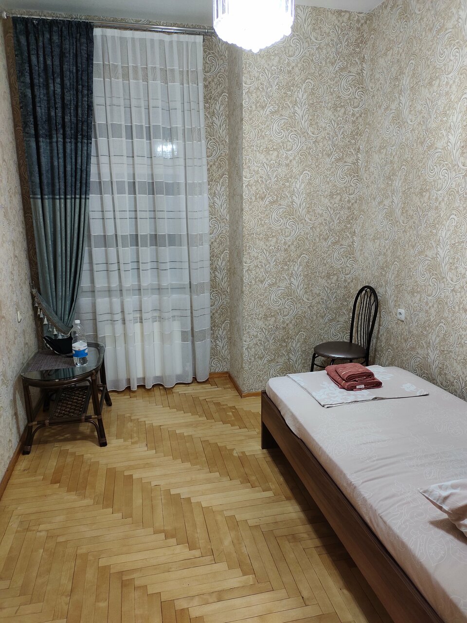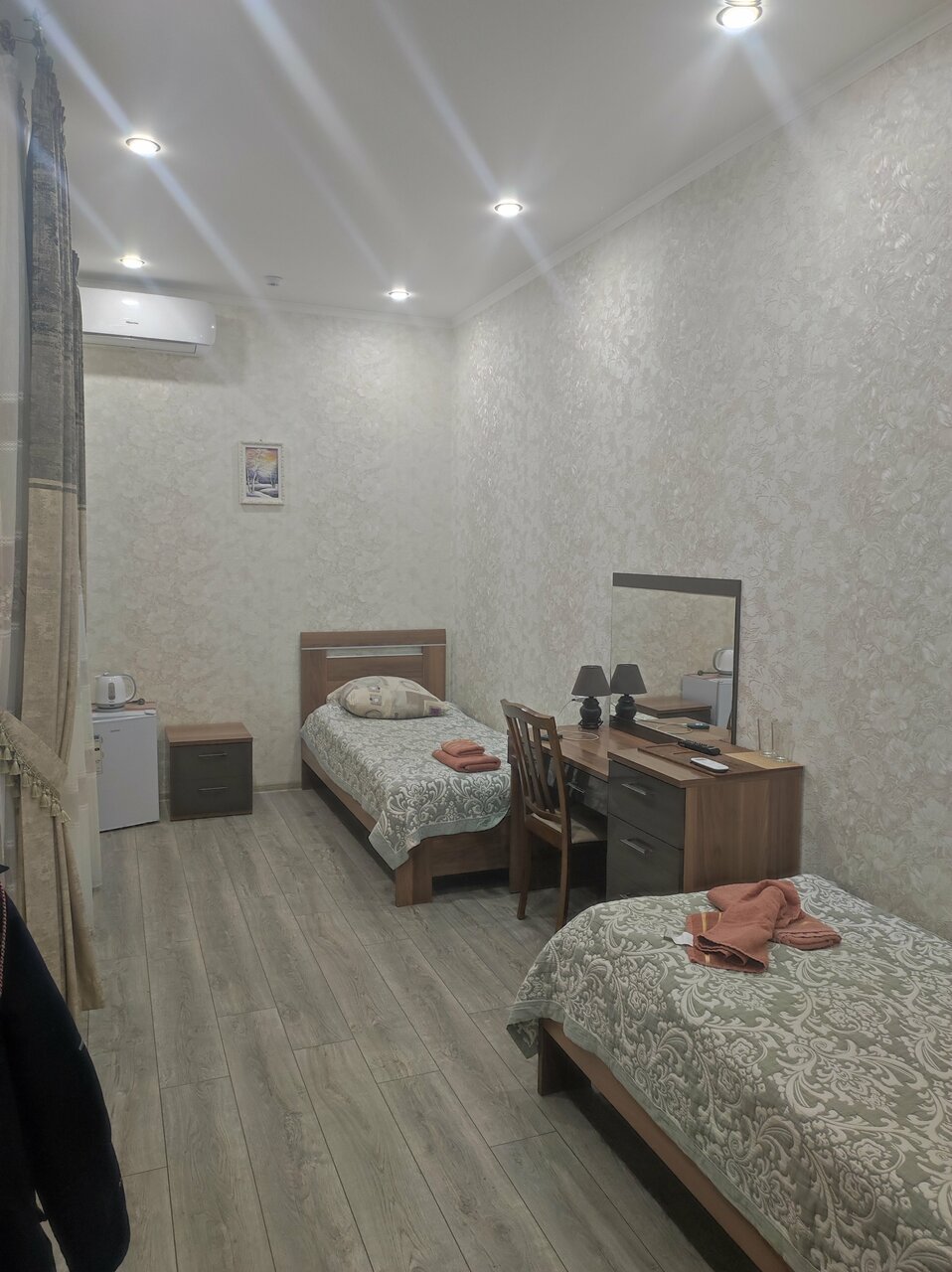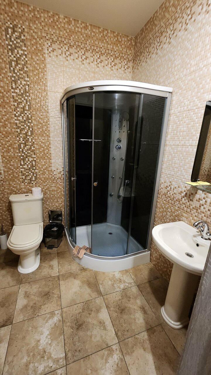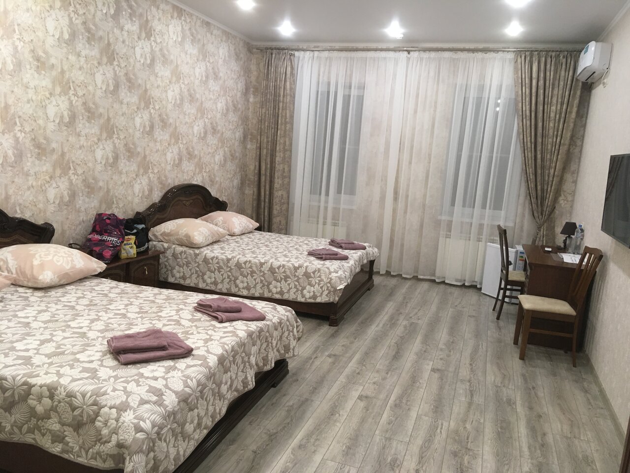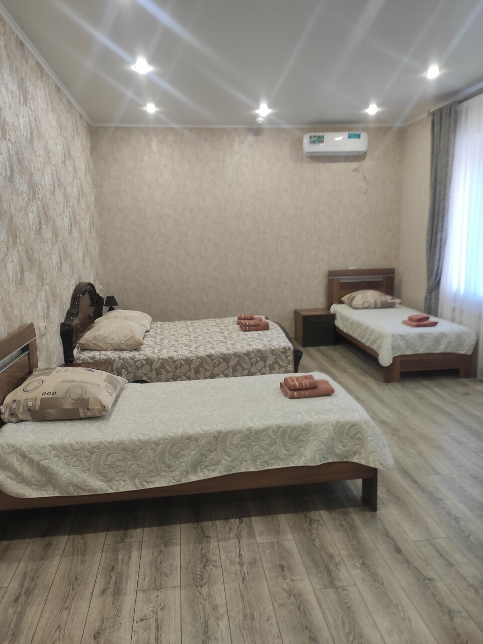 У нас был номер на 4-х. Мне понравилось — всё чисто, аккуратно, номер большой, высокие потолки, телевизор, душевая кабина. Утром можно позавтракать — в принципе вкусный домашний завтрак. Удобное место отдохнуть при поездке до моря.