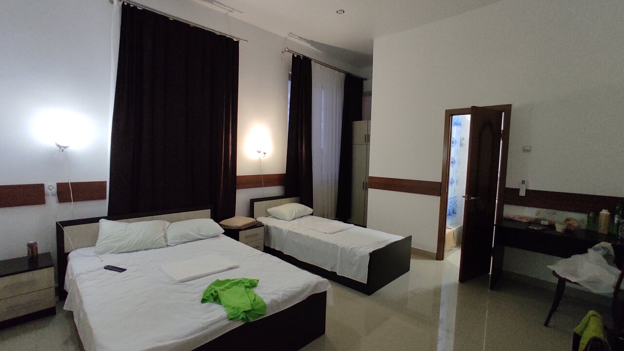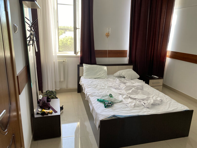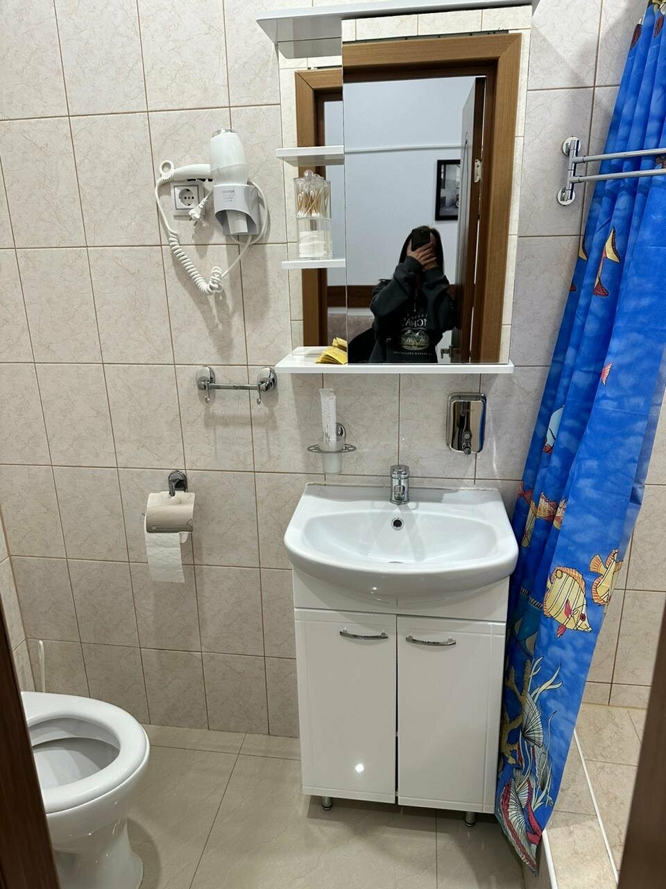 Очень чисто в номере. Есть одноразовые расходники (паста,щётки,шампунь,мыло). Приятная администратор Фатима. Отлично выспались. Удобные кровати. Есть фен. Из неудобств,что чайник и холодильник в коридоре и нет ложек.