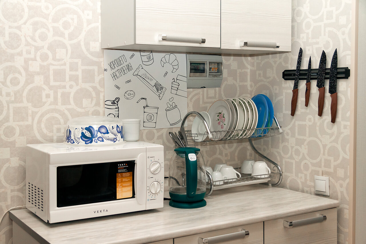 - Наличие кухни с посудой и холодильником.
