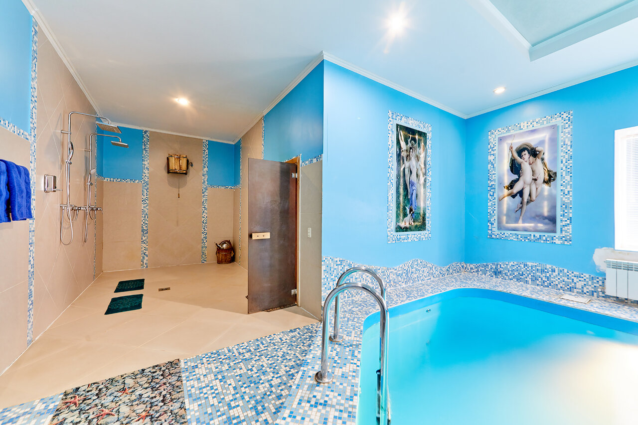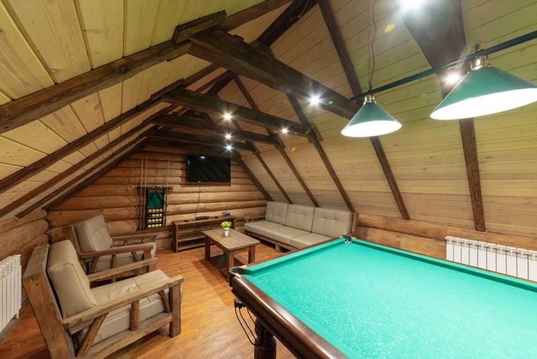 - Деревянная баня с бассейном, бильярдом, комнатой отдыха, столовой и летней верандой на большую компанию (до 10 чел.). Будние дни после 18.00, Выходные свыше 4 часов. 1400₽