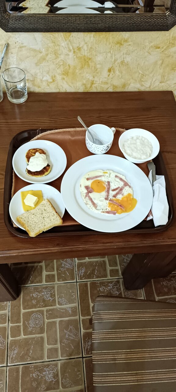 Снаружи все красиво. Номера потёртые. Полотенца изношеные. Завтрак приносят в номер. Каша, яичница, сырники сыр и чай.