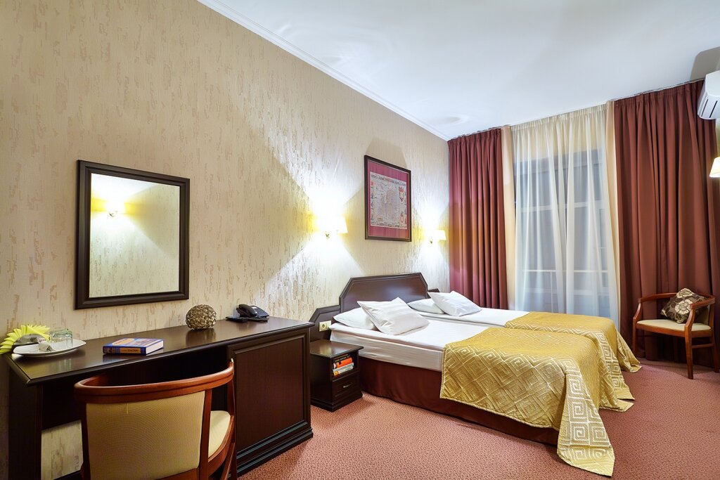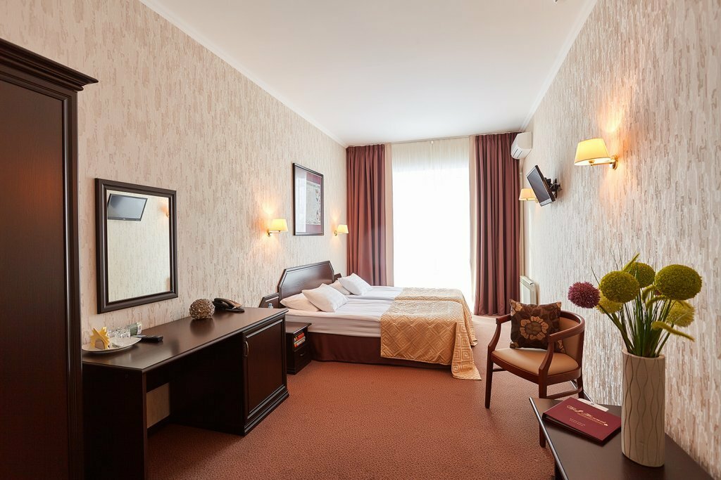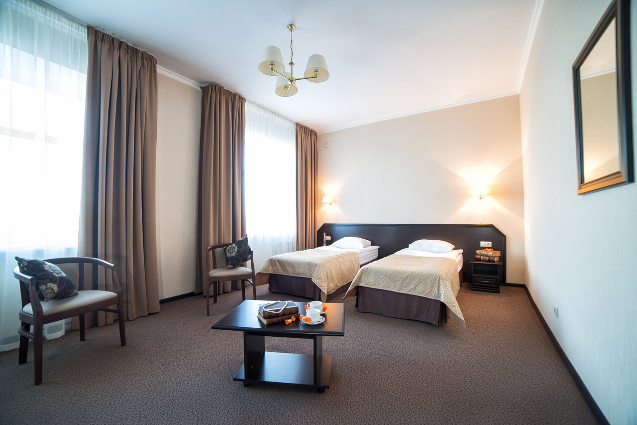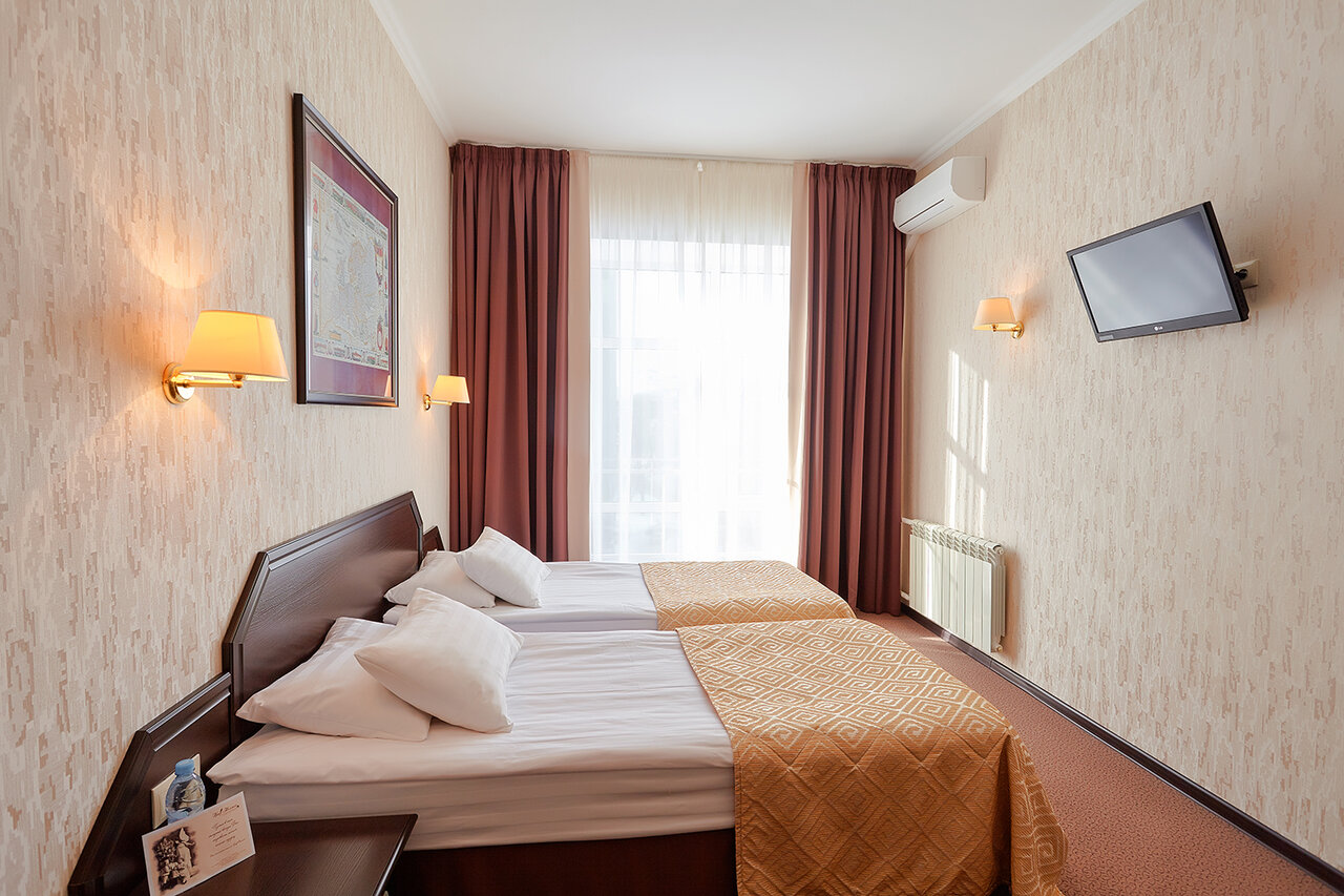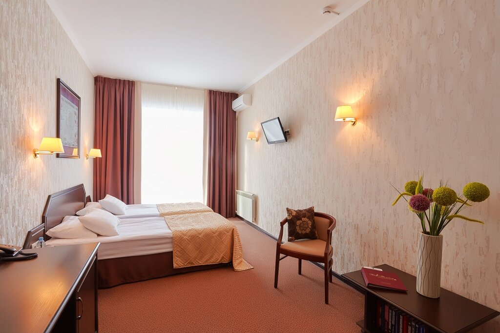 Номера комфортные. В номере есть маленький чайник, пакетики чая и растворимого кофе, бутилированная вода. В фае на третьем этаже находится кулер. Для клиентов отеля есть бесплатная возможность посещения бассейна и сауны. Из минусов — слабый фен, однообразные завтраки, из овощей — пластмассовые помидоры и огурцы, фрукты отсутствуют.