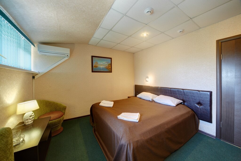 Площадь 24 кв м. Одна двухспальная большая кровать прикроватные тумбочки, LED ТV, холодильник, стол журнальный, диванкресла, вешалка для одежды, 4 полотенца, комплект постельного белья, душевая комната, С/у, зеркало для бритья и макияжа, тапочки, на