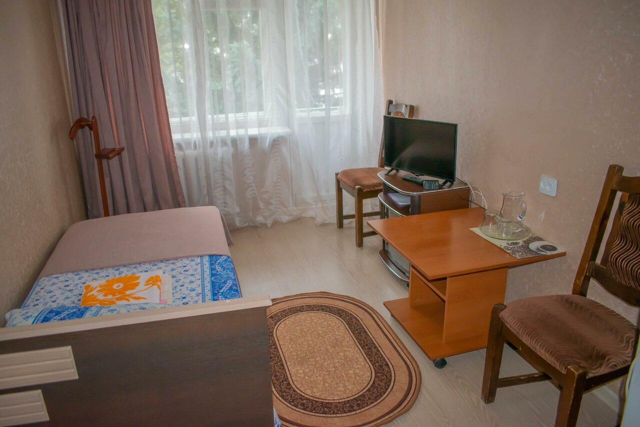 - В номерах есть необходимые вещи (холодильник, телевизор, посуда).; Вкусная и недорогая еда в столовой.; Тишина.; Удобное расположение (рядом с парком).; Наличие балкона.