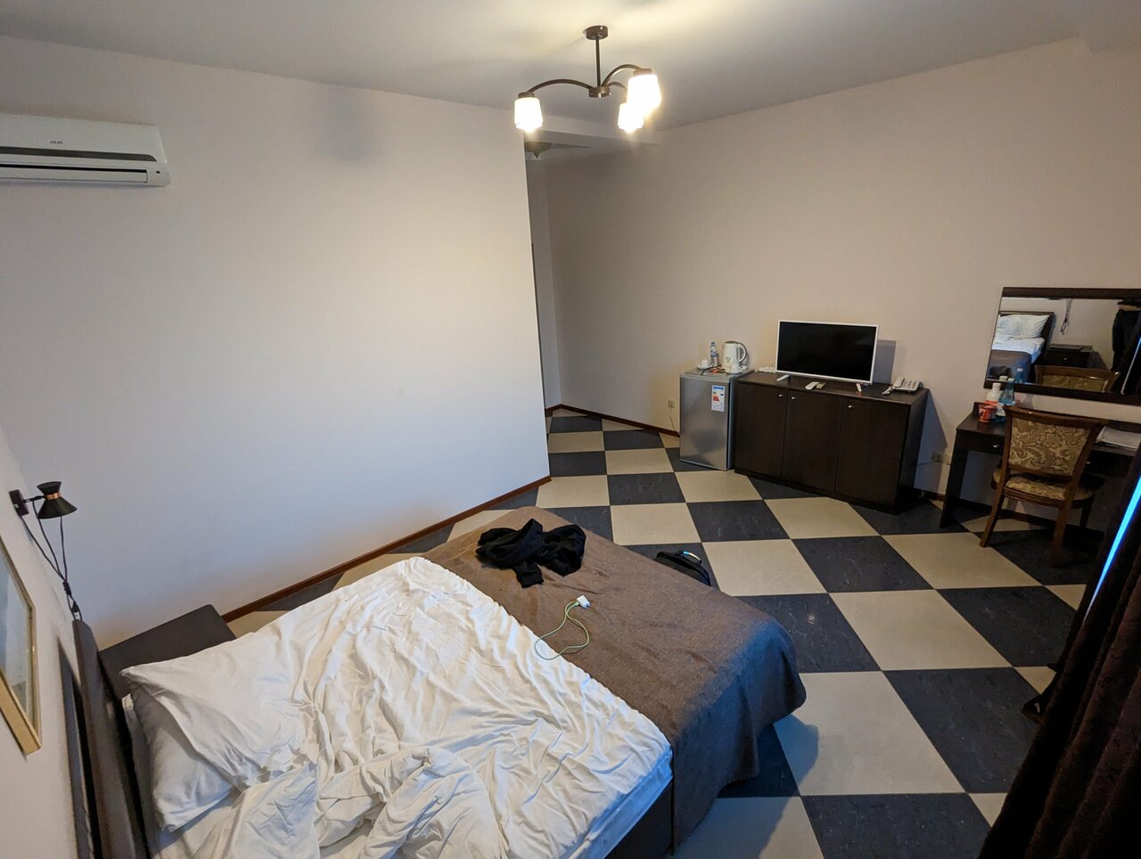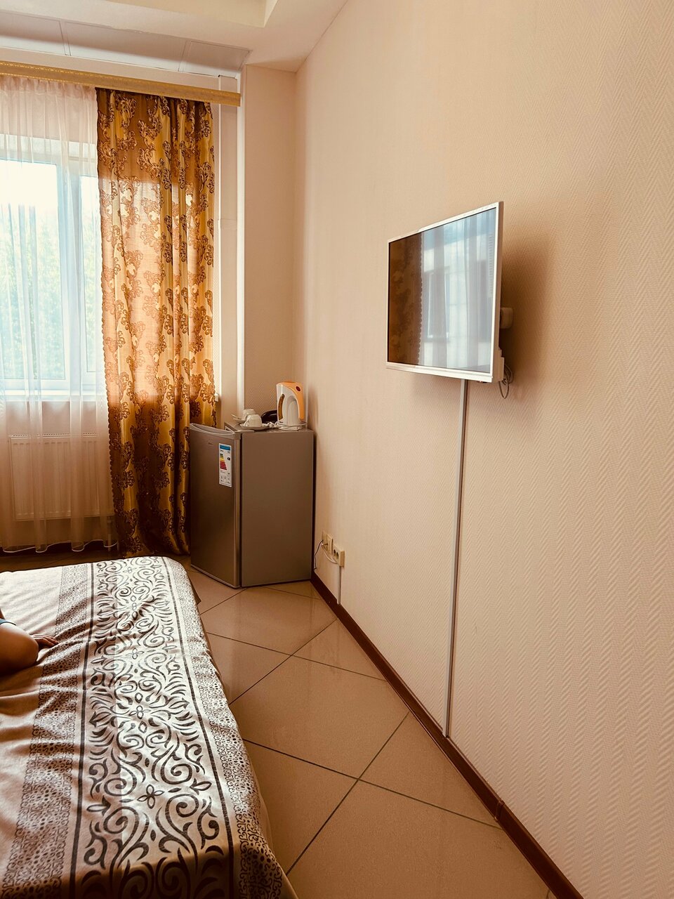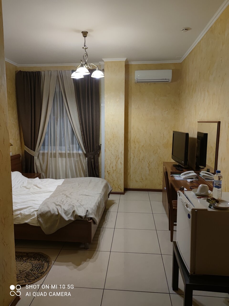 Хорошие просторные номера. В номере есть холодильник, чайник, сплит система. Жил одни сутки, в целом номер своих денег стоит.