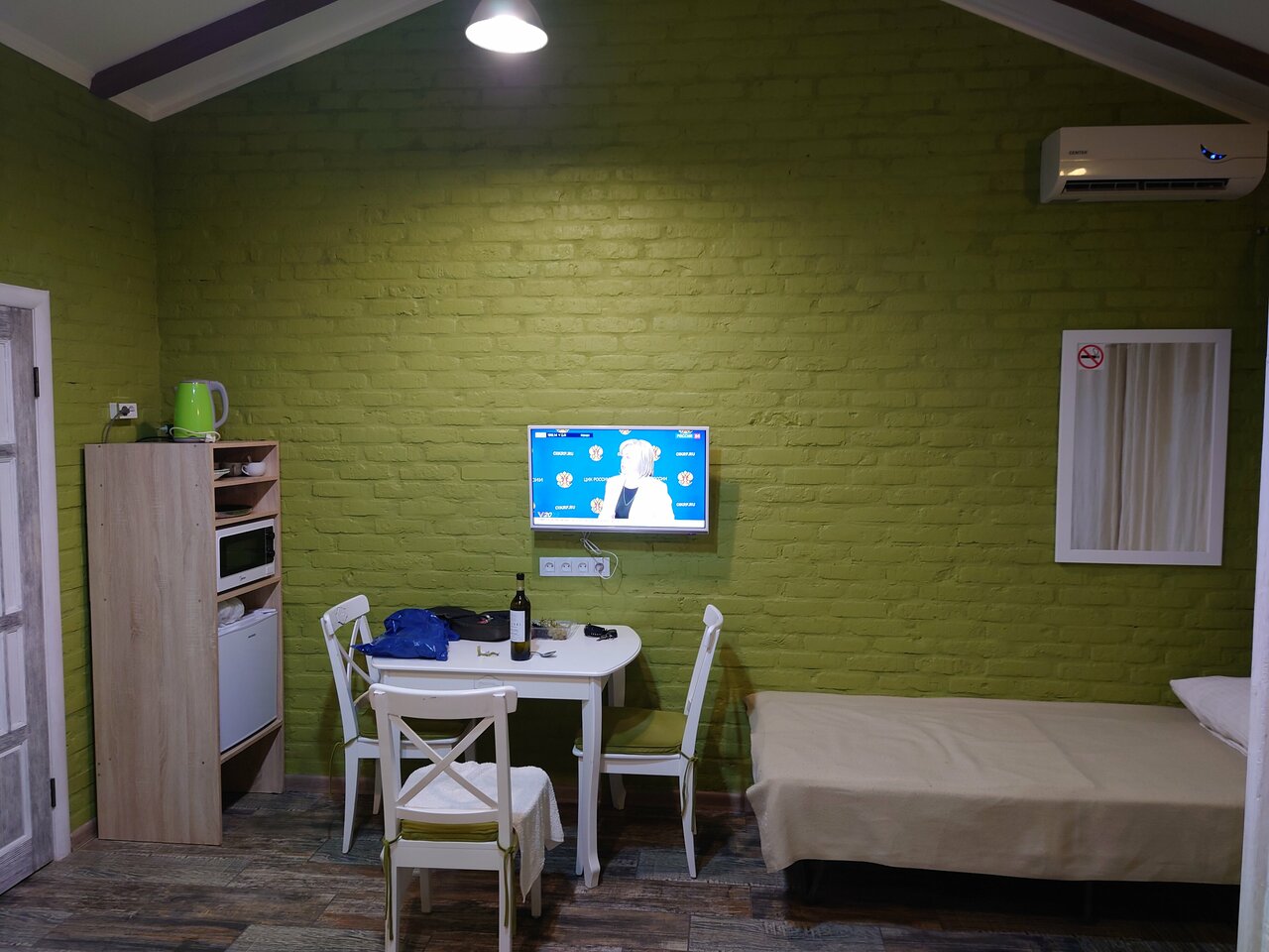 - В номере есть всё необходимое (санузел, телевизор, холодильник, кондиционер, микроволновка, чайник, посуда).