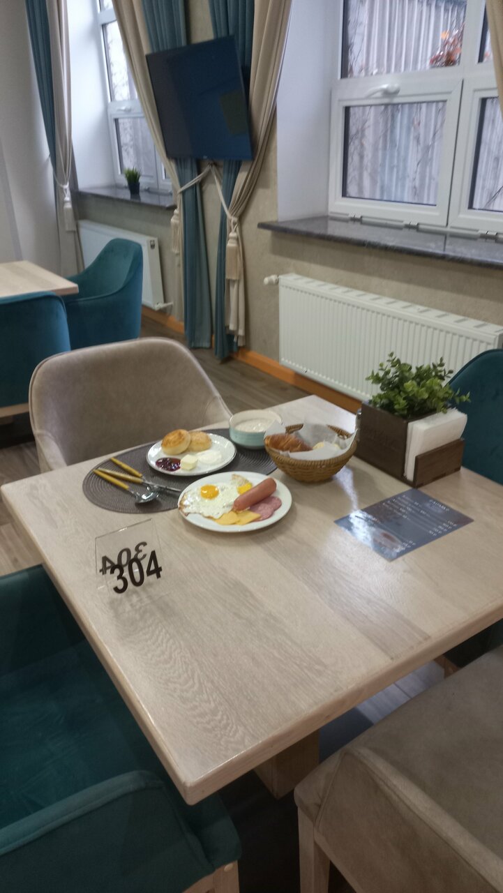 Бронировали номер по телефону. Останавливались проездом на одну ночь. Были втроем. Номер очень хороший, одна комната, но уютная. С большой двуспальной кроватью и большим диваном. В цену был включён завтрак. Об этом тоже не пожалели. Всё было вкусно и сытно.