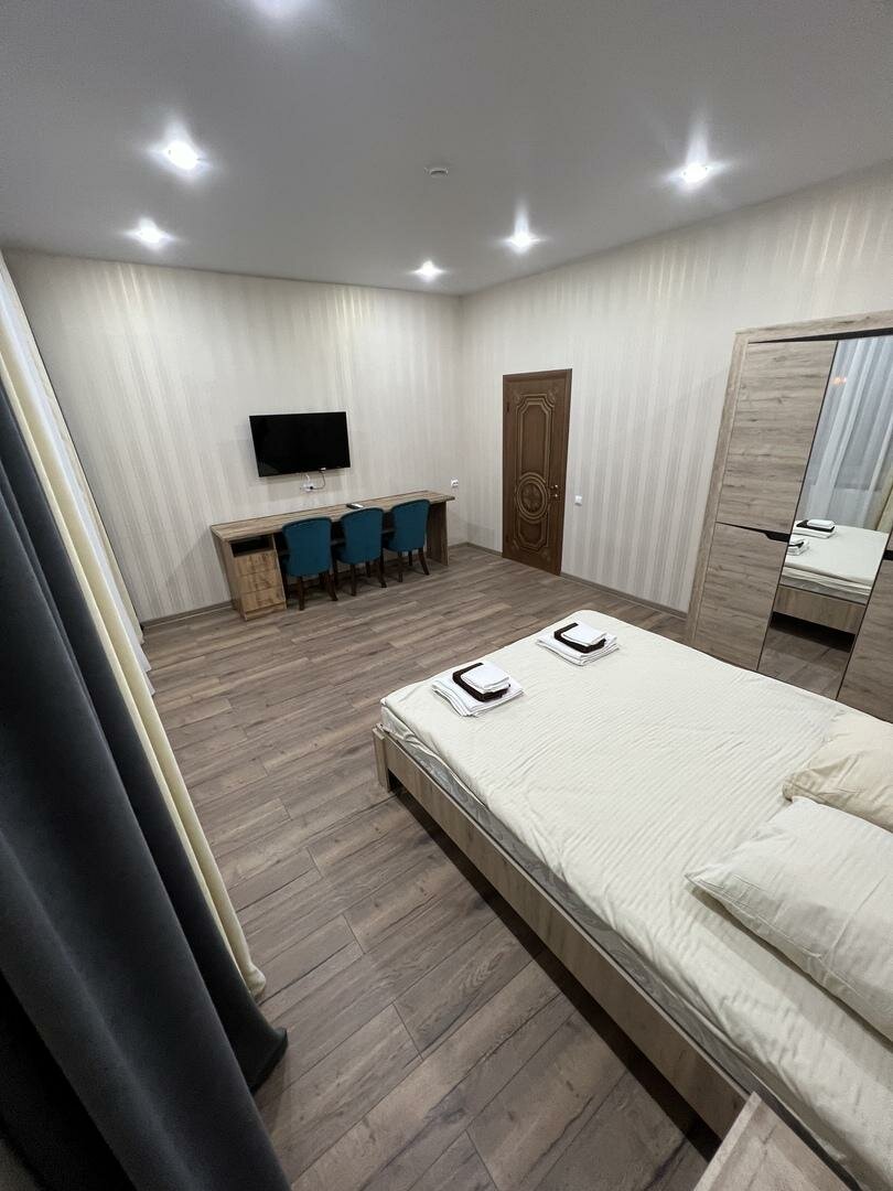 Хороший отель. Есть все необходимое. Номер чистый, матрас хороший, удалось выспаться. Есть кафе ️ готовят там вкусно, кухня закрывается в 22, но есть буфет, можно попить чай или кофе с выпечкой. Если хотите развлечений есть караоке. Машина прекрасно стояла на парковке, а в шаговой доступности есть магнит, магнит косметик, что очень удобно так как из косметики в номере только жидкое мыло. Из рекомендаций могу сказать только одно- если в номере будет бутылочка 0,5 воды как в привычных отелях, это было бы приятно. Я была проездом и местная вода- сильно отличается от привычной.