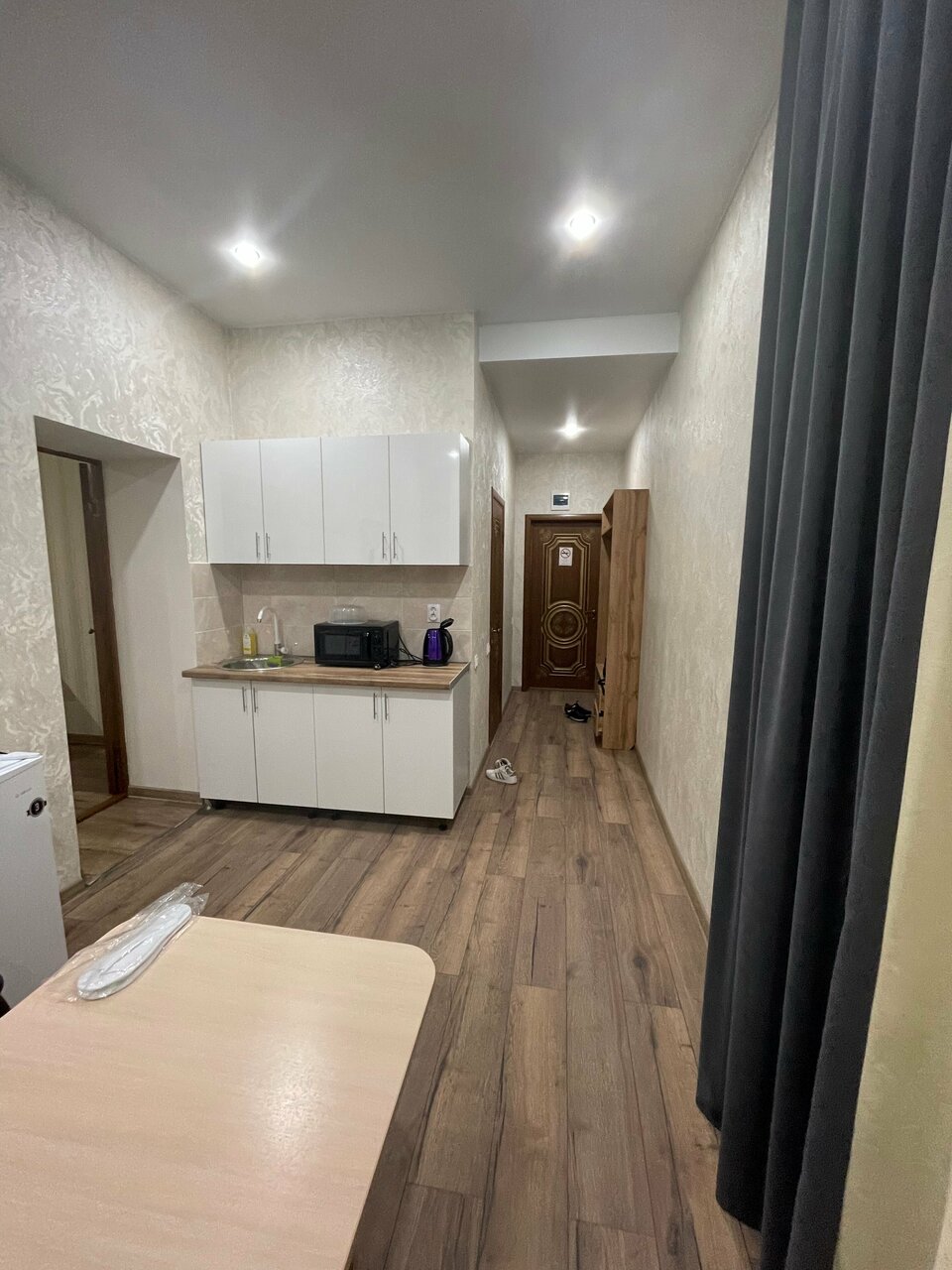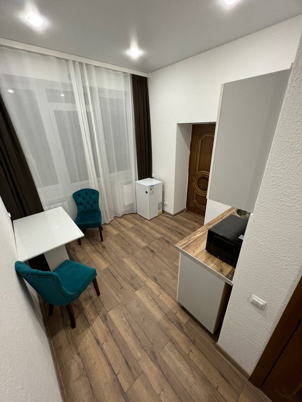 Отель понравился! Всё как на фото. Номер люкс: прихожая, ванна с туалетом, гостиная с зоной кухни(чайник, микроволновка, посуда) и спальня. На 1 этаже кафе с отличным меню!