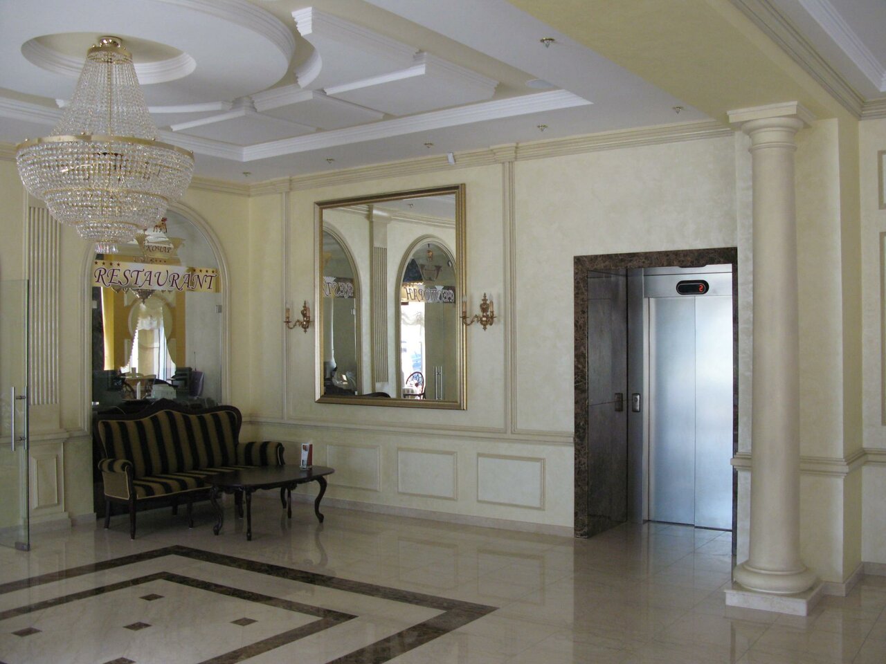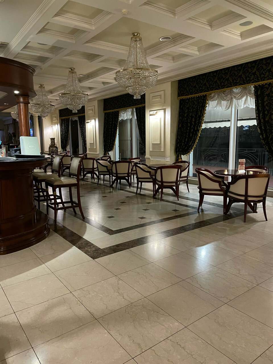 ветшающая роскошь, слабеющая тень былой успешности – всё говорит о том, что на вчерашней славе далеко не уедешь. Неприятно было увидеть в санузлах ржавчину, текущие бачки. Порадовала сервировка в ресторане. Пиво в баре необычно дорогое. Но персонал приветлив