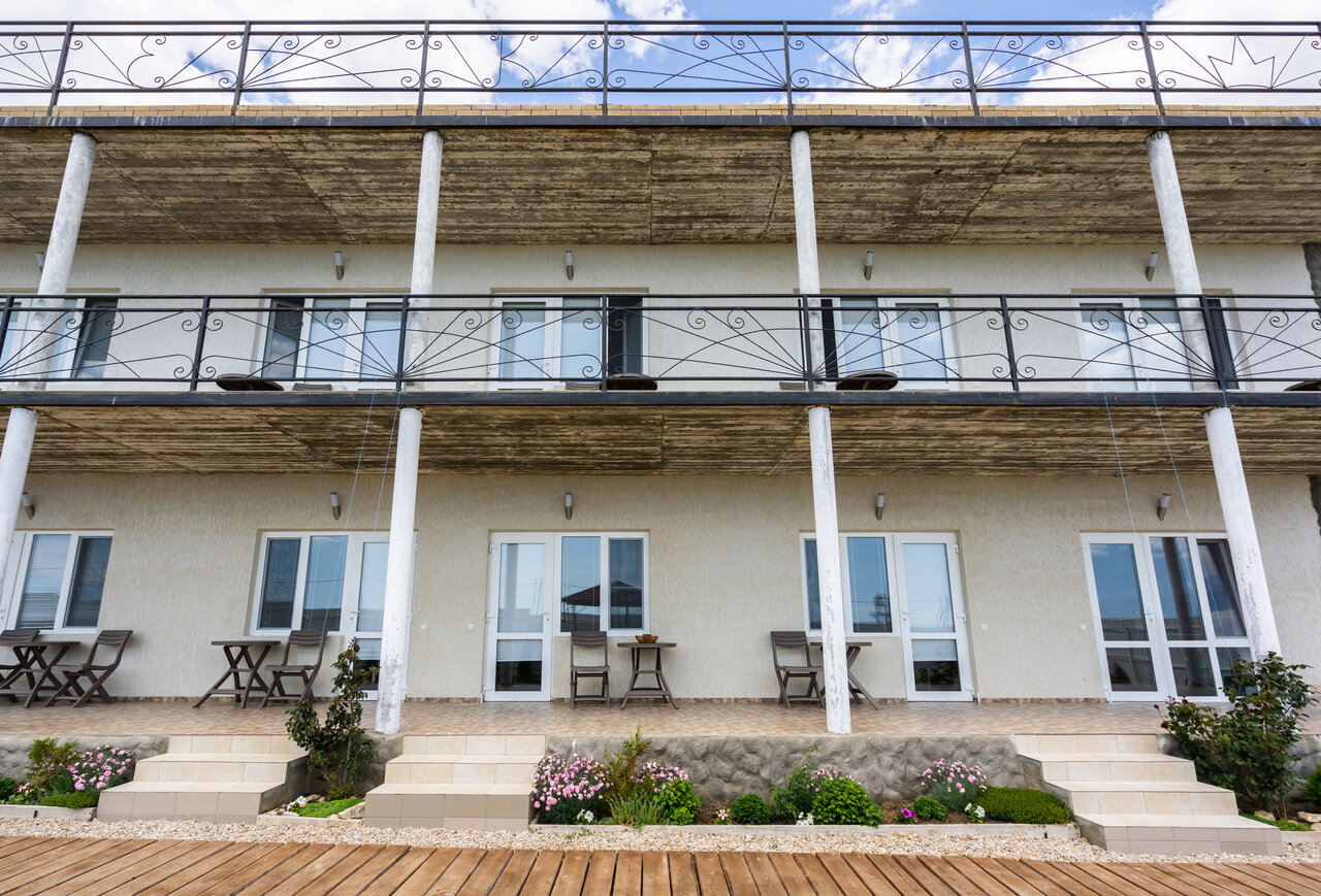 Гостям предлагаются комфортабельные номера (от 1500 до 3500 ₽/ночь) с кондиционером, Wi-Fi, телевизором, холодильником и феном. В распоряжении постояльцев — общая кухня, столовая, терраса, сад и собственный песчаный пляж с баром.