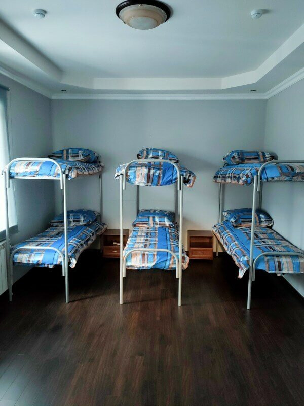 Место в комнате на 6 мест. Общий санузел и столовая на 12 мест.