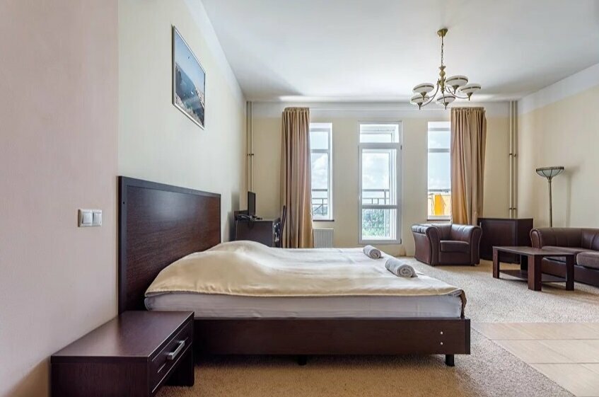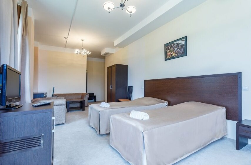 Номер высшей категории гостиницы «Пулково» это просторные двухкомнатные номера повышенной комфортности. Гостиная зона оборудована креслами, письменным столом, ЖК-телевизором, журнальным столиком, здесь же есть холодильник.