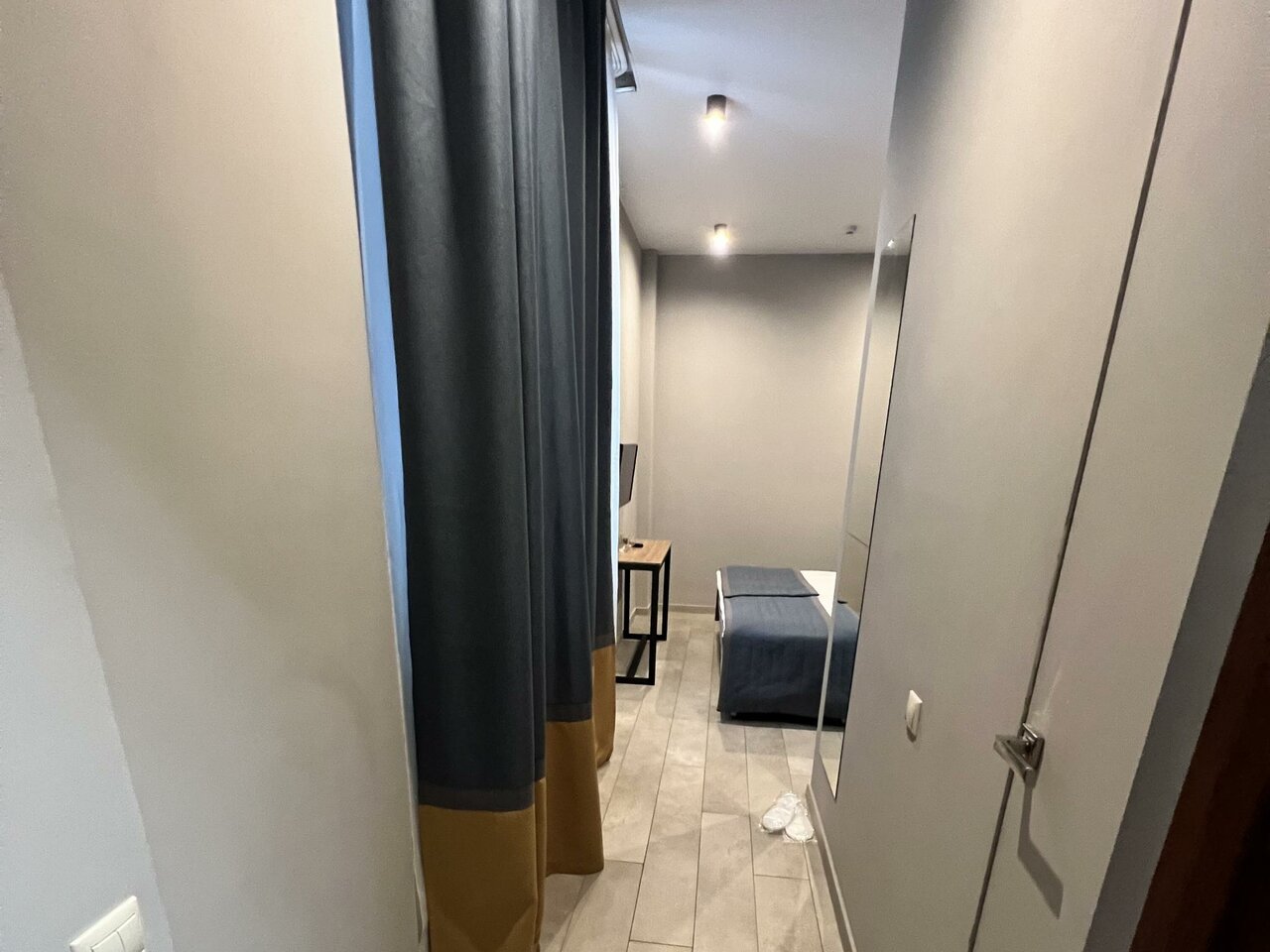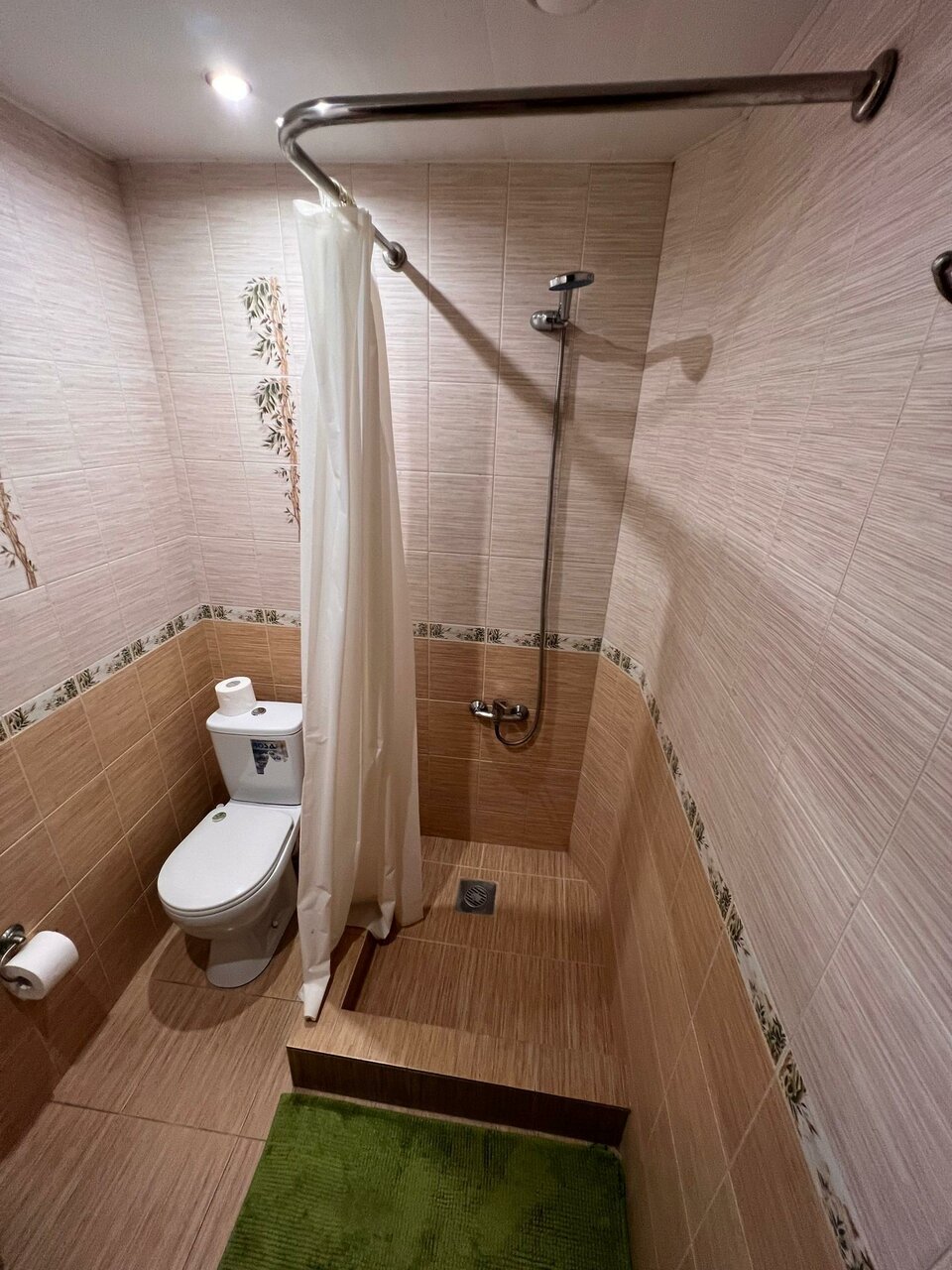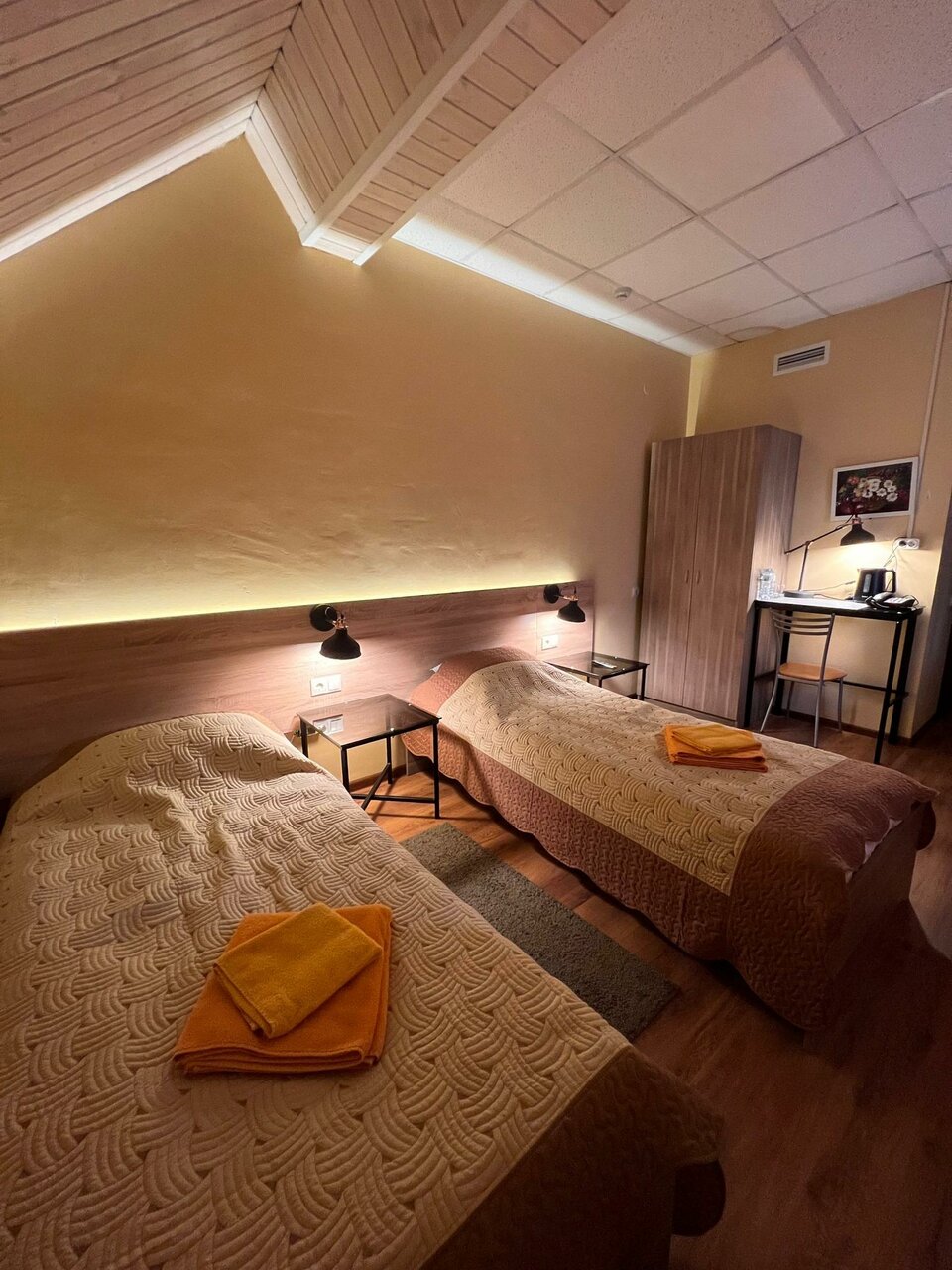Стены картонные, соседей было слышно как будто рядом с нами, сантехника в ванне моющих не видела видимо никогда, лейка вся течёт, подставка под душ сломана, мыться только с душем в руках. Пол в комнате грязный, а тапочки платные, постельное в пятных, стены тоже все в каких то пятнах, окно сломано, не закрывается до конца, и дует сильно, подушки плоские, одеяло пустое. А теперь плюсы есть хороший и рабочий телевизор, чистый новый шкаф с полочками и вешалками, есть писменный стол со стулом, доступ к горячей воде 24/7. А теперь главные минусы, нет телефона для связи с админом, просроченые гели и шампуни, грязь, нет шкафа на входе, что бы оставить верхнюю одежду, цена завышена для такого номера, платные тапочки. Мы приехали после суток без сна, нам главное было упасть спать.