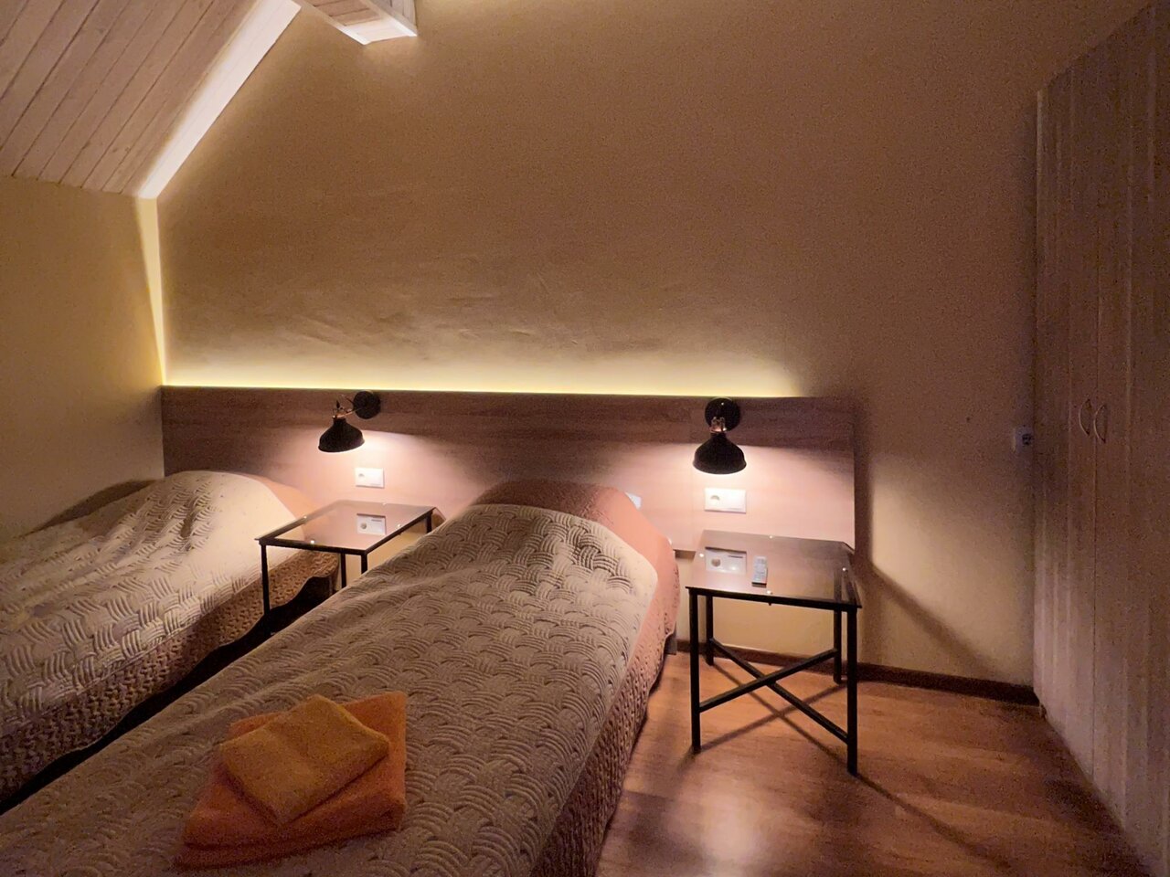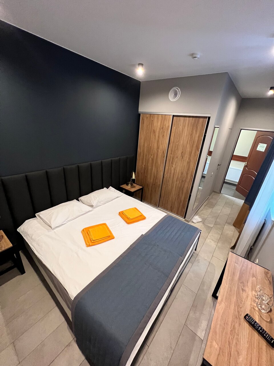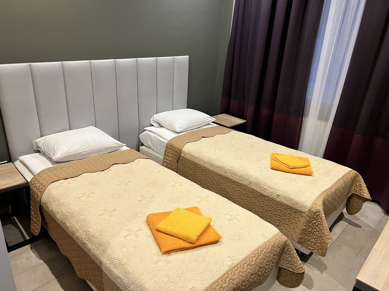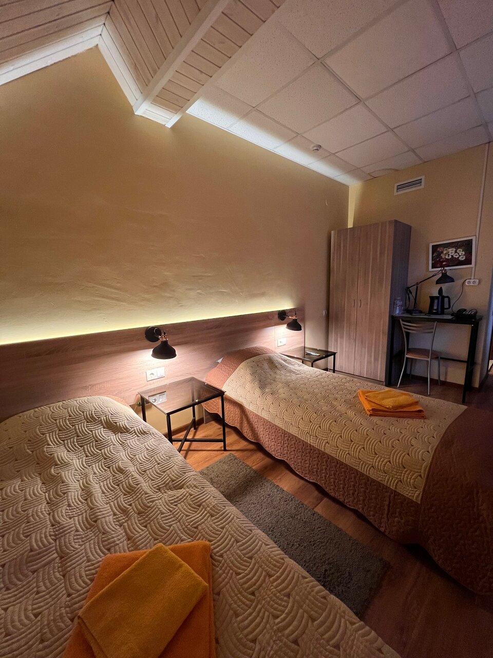 Стены картонные, соседей было слышно как будто рядом с нами, сантехника в ванне моющих не видела видимо никогда, лейка вся течёт, подставка под душ сломана, мыться только с душем в руках. Пол в комнате грязный, а тапочки платные, постельное в пятных, стены тоже все в каких то пятнах, окно сломано, не закрывается до конца, и дует сильно, подушки плоские, одеяло пустое. А теперь плюсы есть хороший и рабочий телевизор, чистый новый шкаф с полочками и вешалками, есть писменный стол со стулом, доступ к горячей воде 24/7. А теперь главные минусы, нет телефона для связи с админом, просроченые гели и шампуни, грязь, нет шкафа на входе, что бы оставить верхнюю одежду, цена завышена для такого номера, платные тапочки. Мы приехали после суток без сна, нам главное было упасть спать.