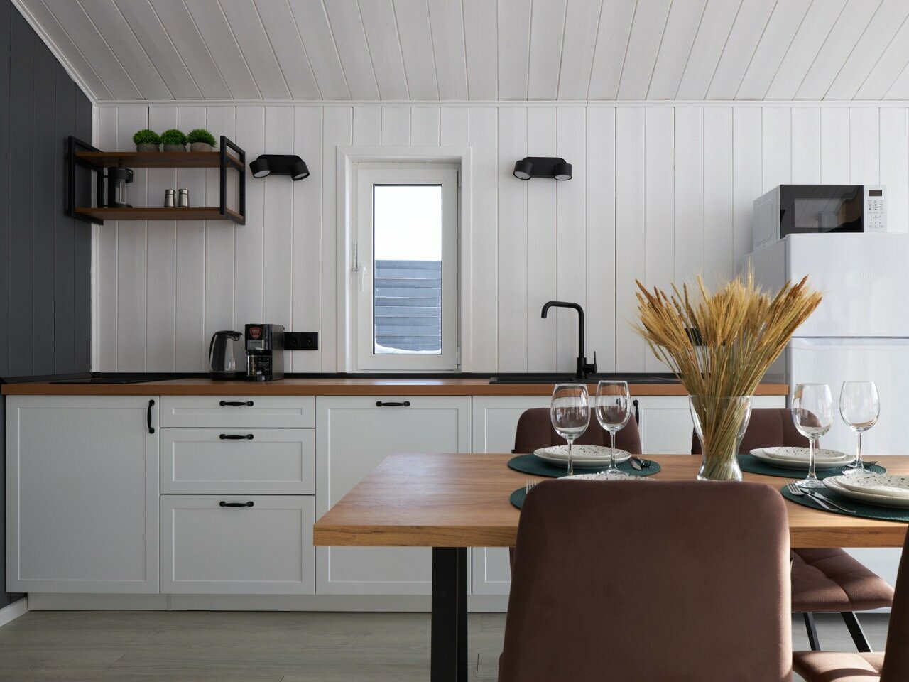 - Полноценная кухонная зона с посудой и техникой.