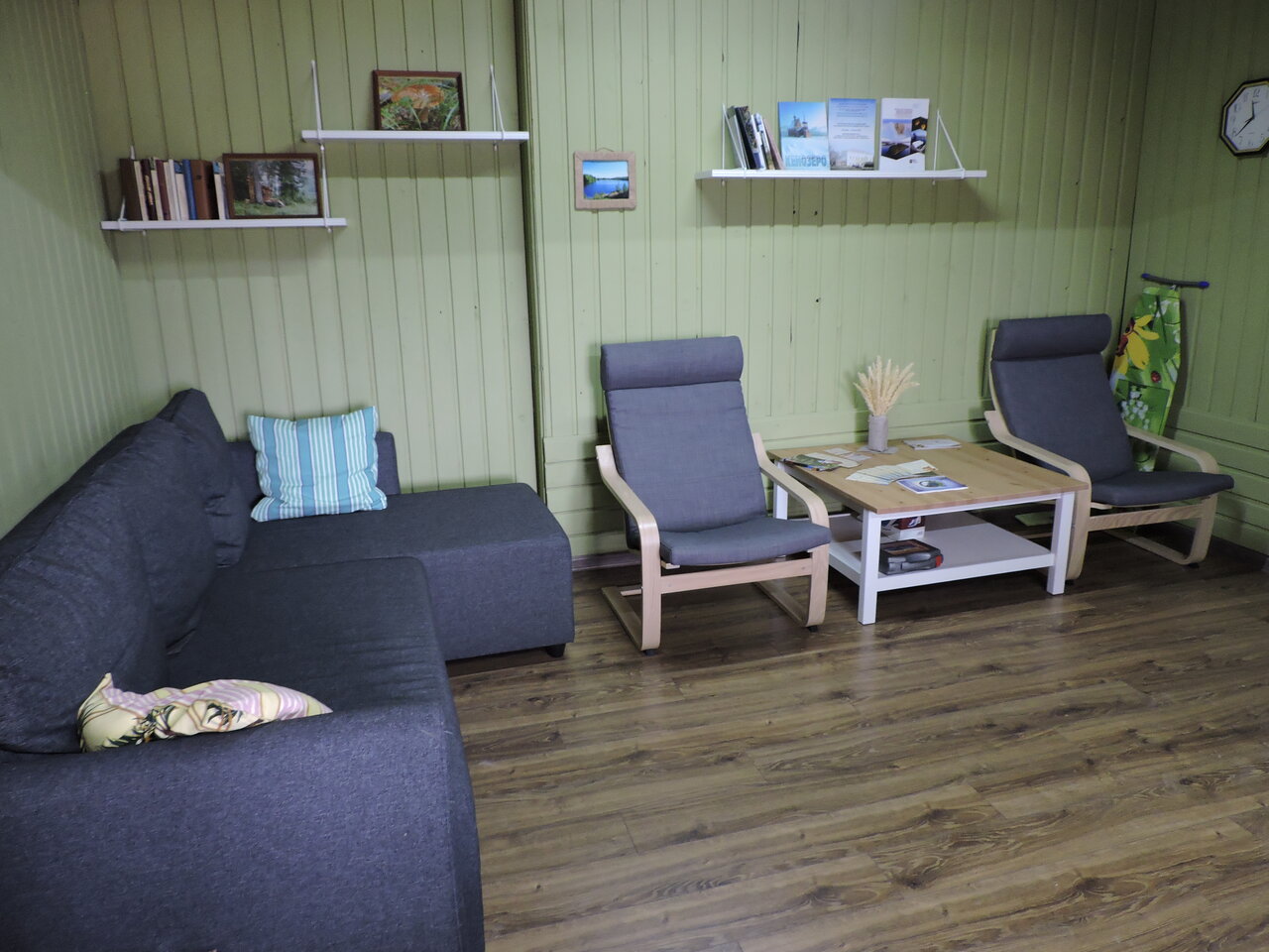 В Гостинице при офисе Каргопольского сектора Парка всего 4 номера: два 1-местных и два 3-местных. Здесь есть общая кухня, оснащённая всем необходимым для приготовления еды: газовая плита, холодильник, чайник, посуда. Душевая и туалет расположены на этаже. Вход в гостинцу отдельный, поэтому вы не будете зависеть от времени работы Офиса. Рядом с гостиницей можно заказать русскую баню. На втором этаже офиса находится конференц-зал, удобный для проведения семинаров и совещаний. В шаговой доступности находится почта, магазин, деревенский клуб, библиотека.