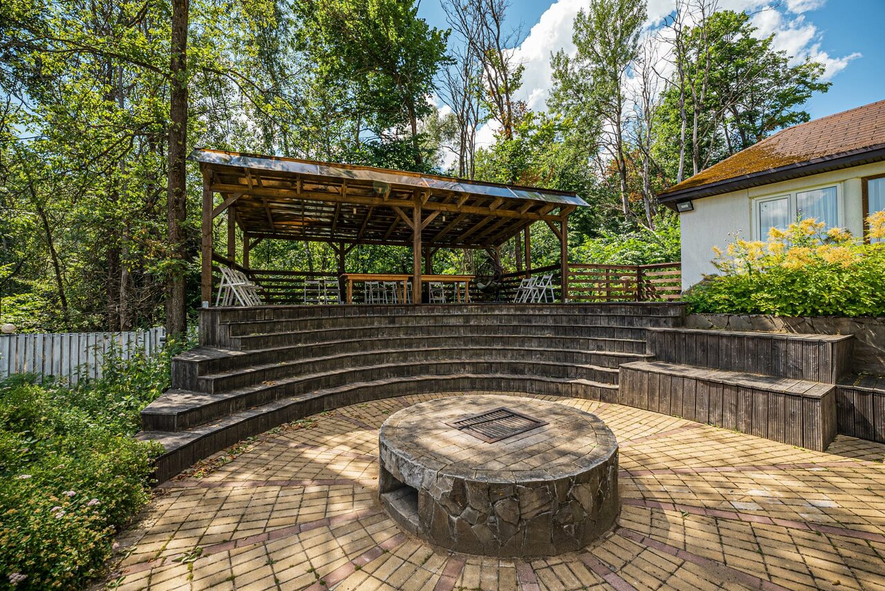 Домик у реки + мангал , рассчитанный до 10 человек со всем необходимым (уголь, 2 решетки или 5 шампуров, спички, розжиг, блюдо под мясо, набор посуды на каждого гостя) на территории парк-отеля 'Вишнёвый сад'