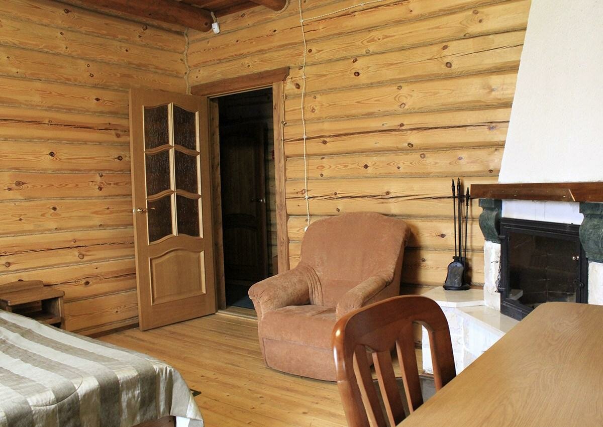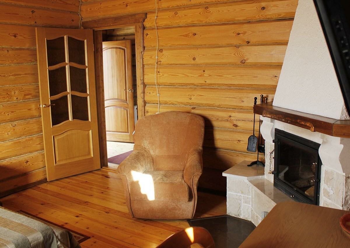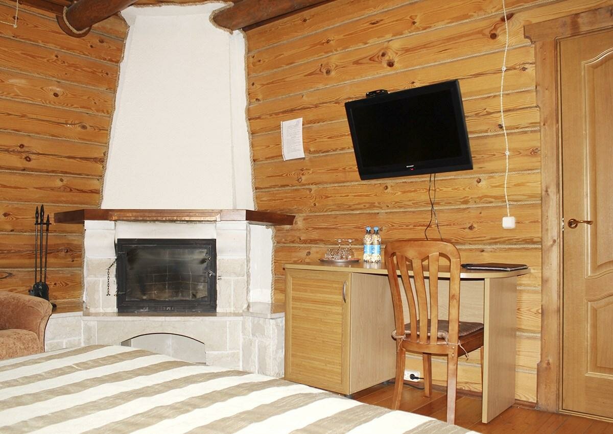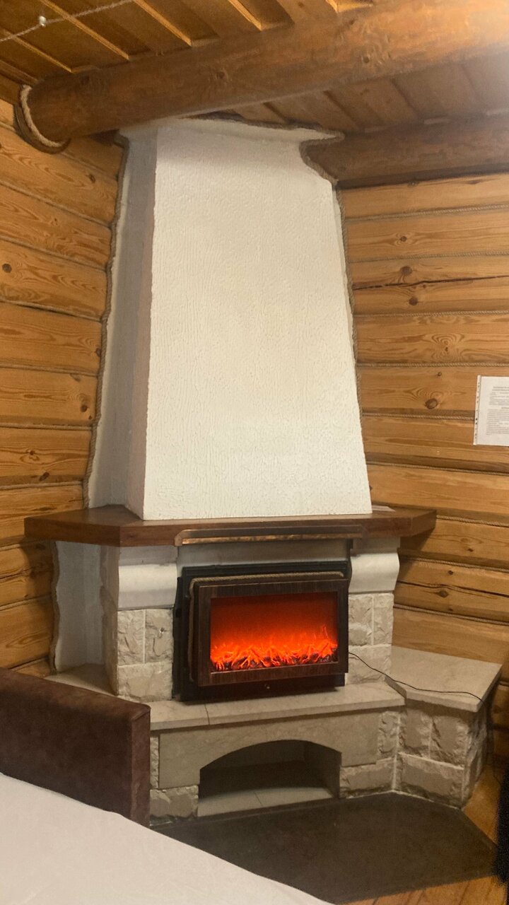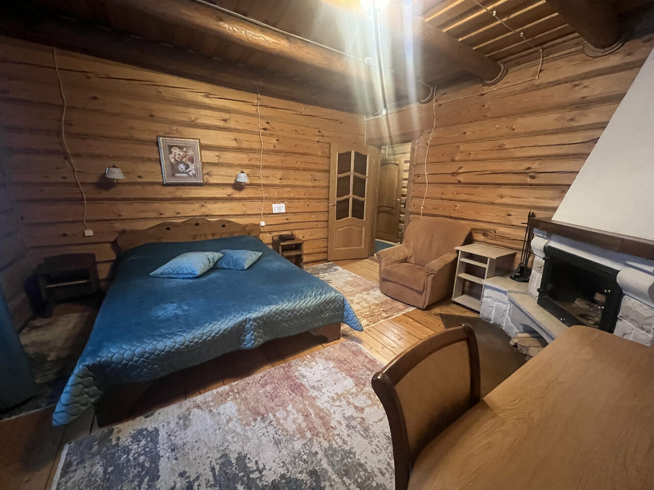 Номер с камином , двуспальной кроватью в деревянном коттедже