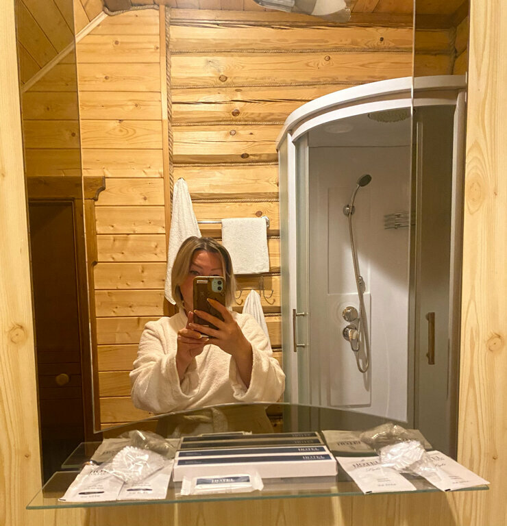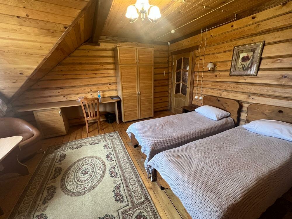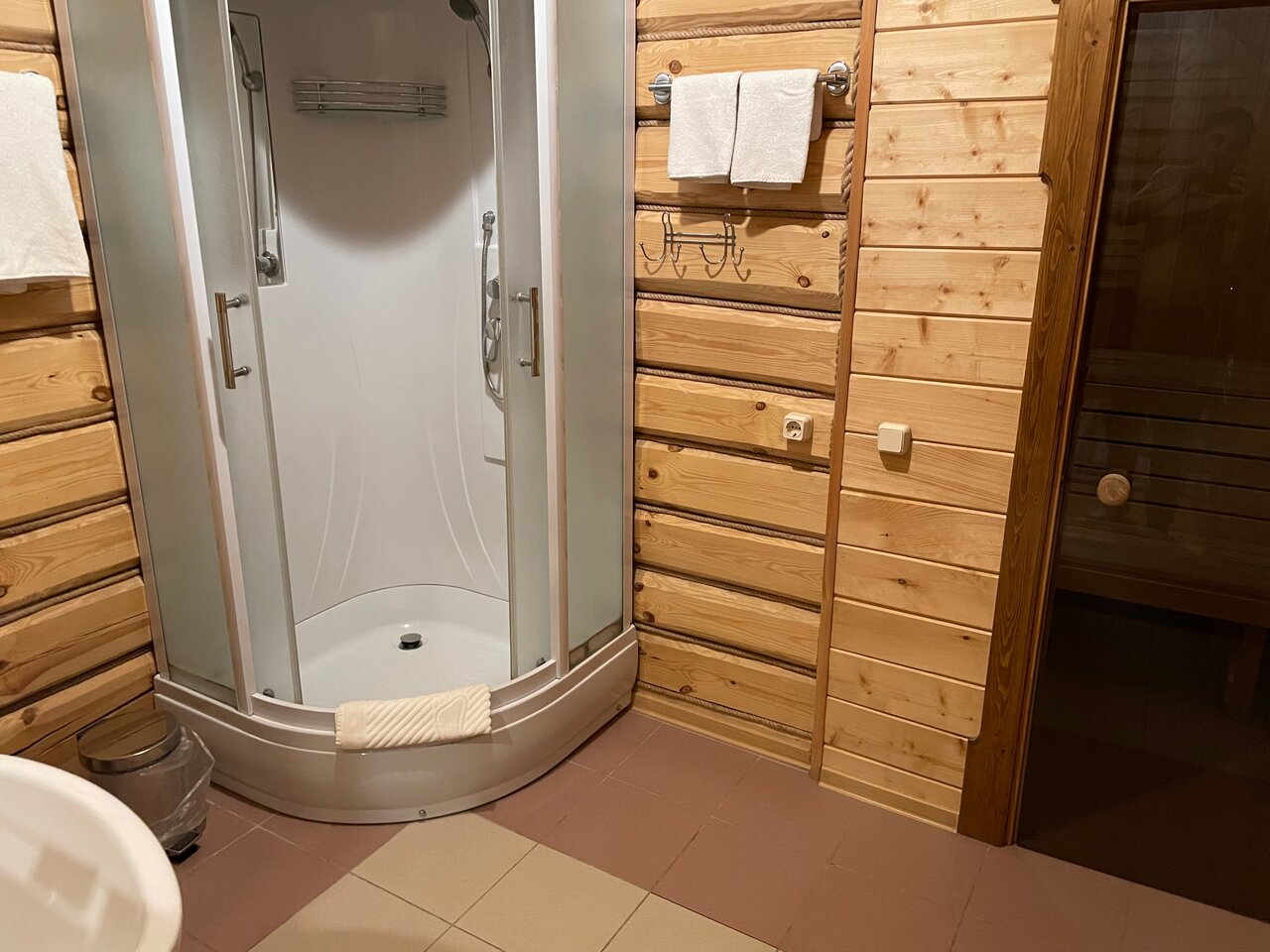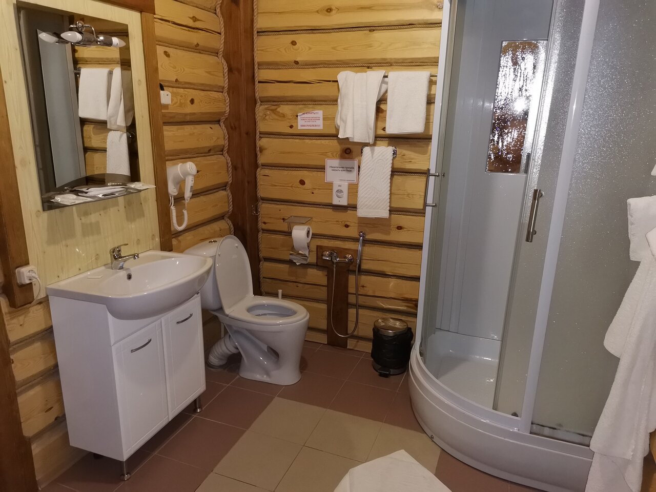 Довольно таки отличное место, я вам скажу. Остановились переночевать после долгой дороги. Факт увиденного превзошел все мои ожидания(а ожидал я тусклую ночлежку), так как нас поселили в прекрасный коттедж выполненный из деревянного сруба, внутри которого был камин, сауна, большая кровать. И площадь комнат очень даже просторная. Так что, молодцы. Единственный момент чуть негатива — в мини баре напитки безалкогольные и шоколад платно, Но об этом администратор умолчал. Неприятный момент