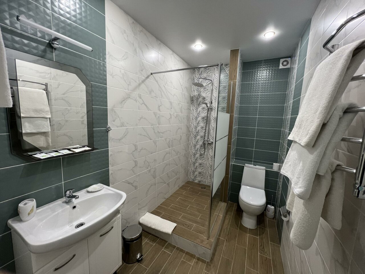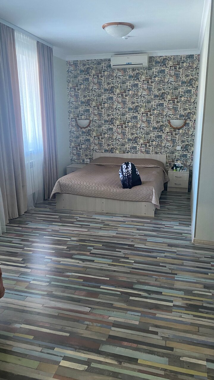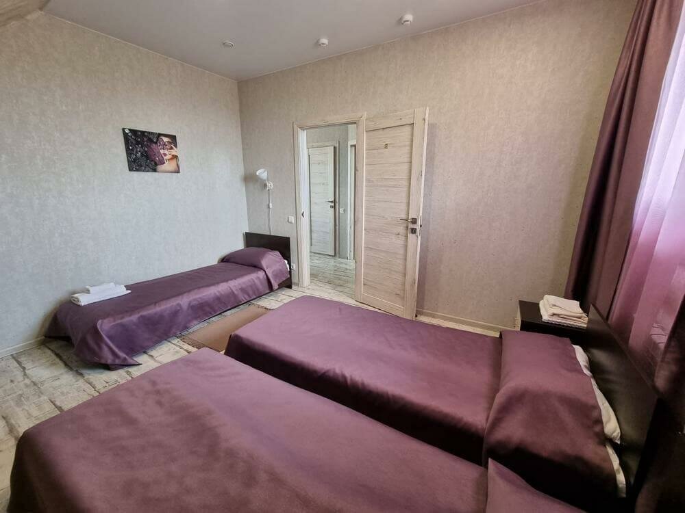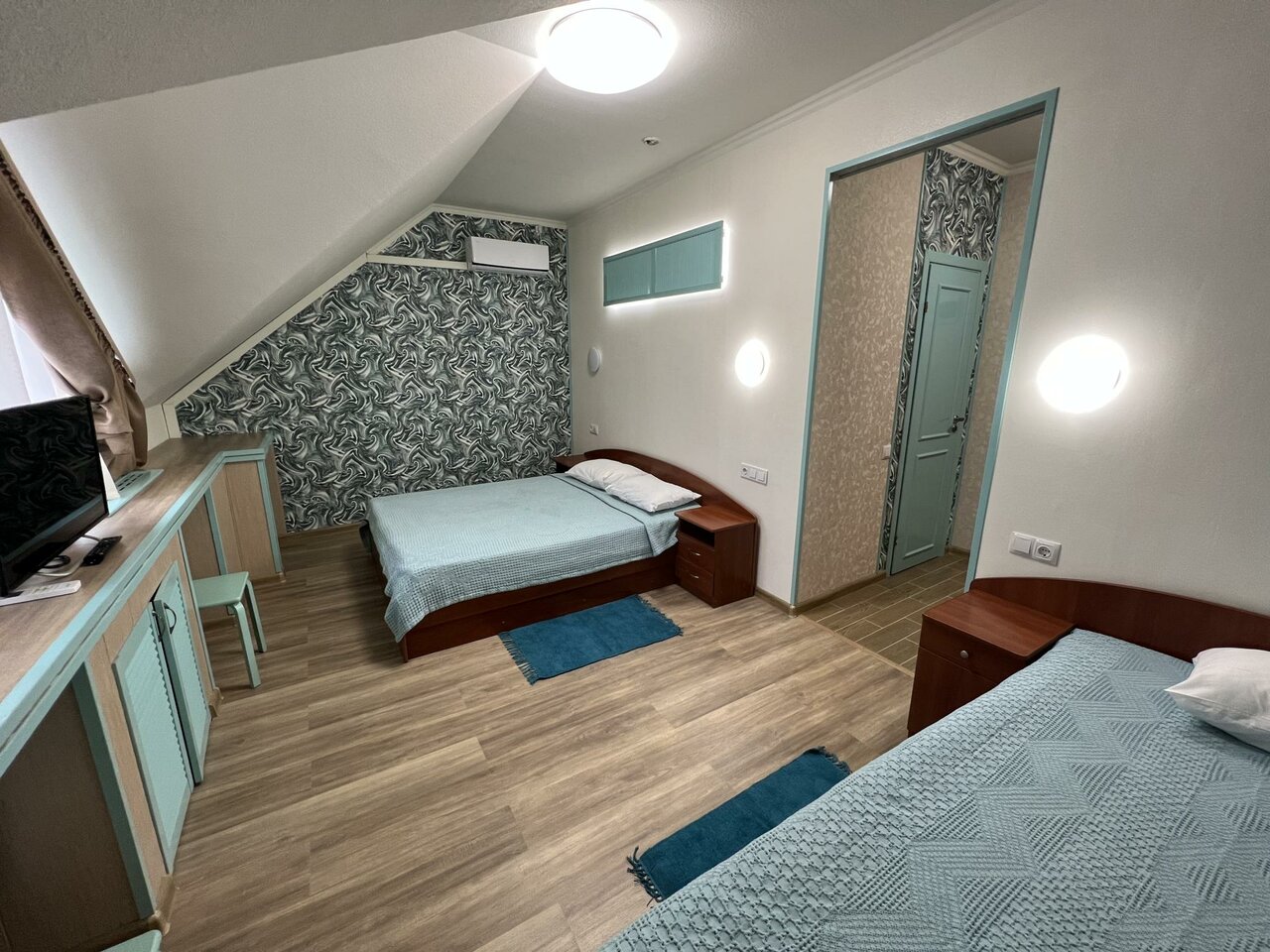 Трехместный номер, одна двуспальная кровать(160) и одна полутороспальная кровать(120), комфортный просторный номер с большой душевой.