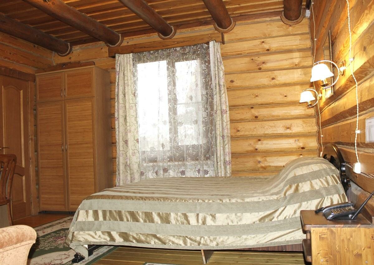 Двухместный номер в деревянном коттедже с сауной и камином, в номере двуспальная кровать.