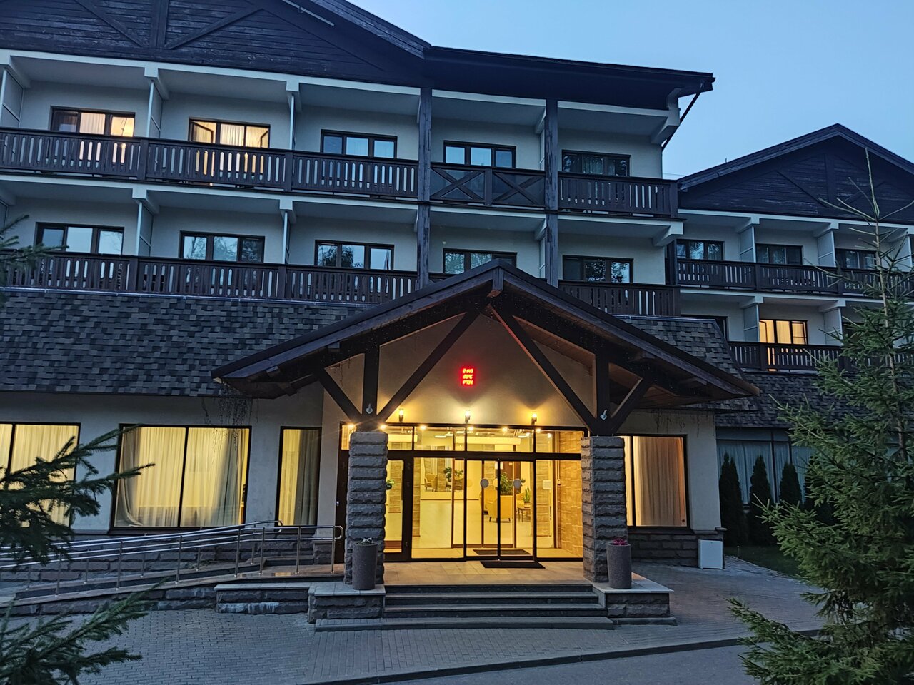 Отличное место на берегу водохранилища. Очень живописное окружение- красочные коттеджи среди сосен и елей. Территория ухоженная. Имеется замечательный бассейн. Столовая по типу шведский стол выше всех позвал. Очень вежливый и предупредительный персонал.