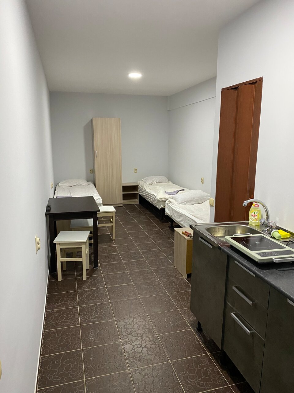 Уютный увеличенный номер с двуспальной кроватью и двумя односпальными кроватями, хорошие матрасы для комфортного сна. Сан узел с душевой кабиной. Кухонный уголок