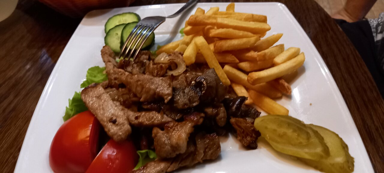 - Вкусная еда в кафе (свинина по-чукавински, оливье, пирожки, ватрушки).