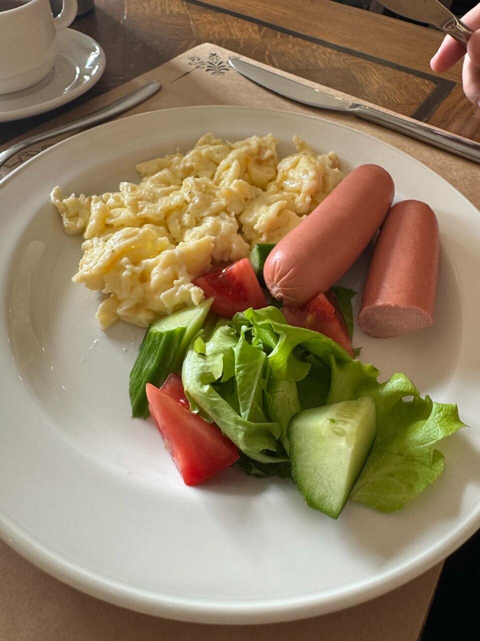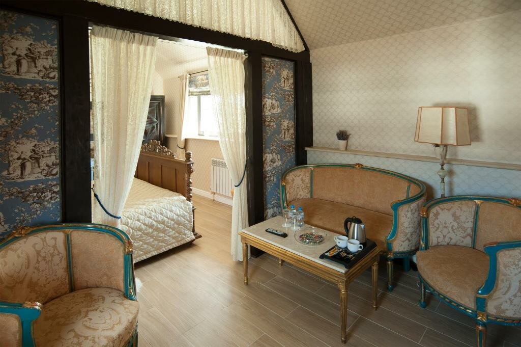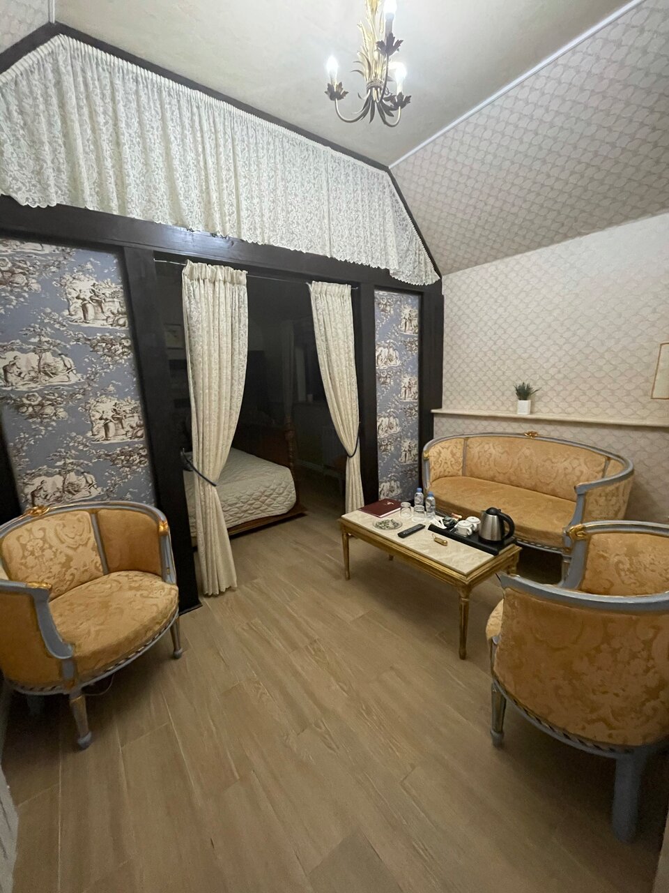 Большая претензия, все вроде не плохо, но мелкие недочеты портят все впечатление. Место совсем не дешевое и пафосное. Кухня показалось НИКАКОЙ. Все не соленье. Ни в чем не нашли какой- то изюминки. В коридорах не отрегулированные датчики включения света , из за чего шарились с телефоном, что бы найти куда вставлять ключ! Вода ужасно воняет. Неужели нельзя поставить приличную водоочистку, чтобы удалить запах??? Связь ужасная. Wi-Fi нет как класс и телевидение через интернет практически смотреть нельзя! Антураж места- присутствует. Хорошо для тех, кто хочет оторваться от цивилизации. Антикварная мебель впечатляет. В этом плане все замечательно. В принципе посетить можно, имея в виду , что столкнетесь с вышеперечисленным