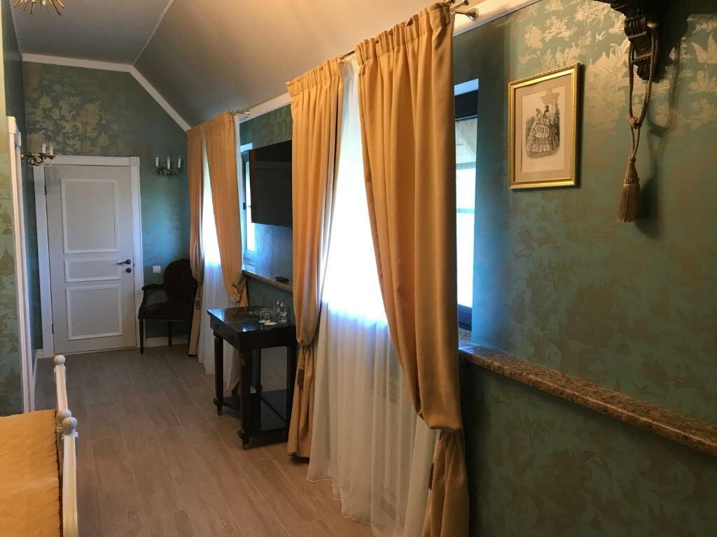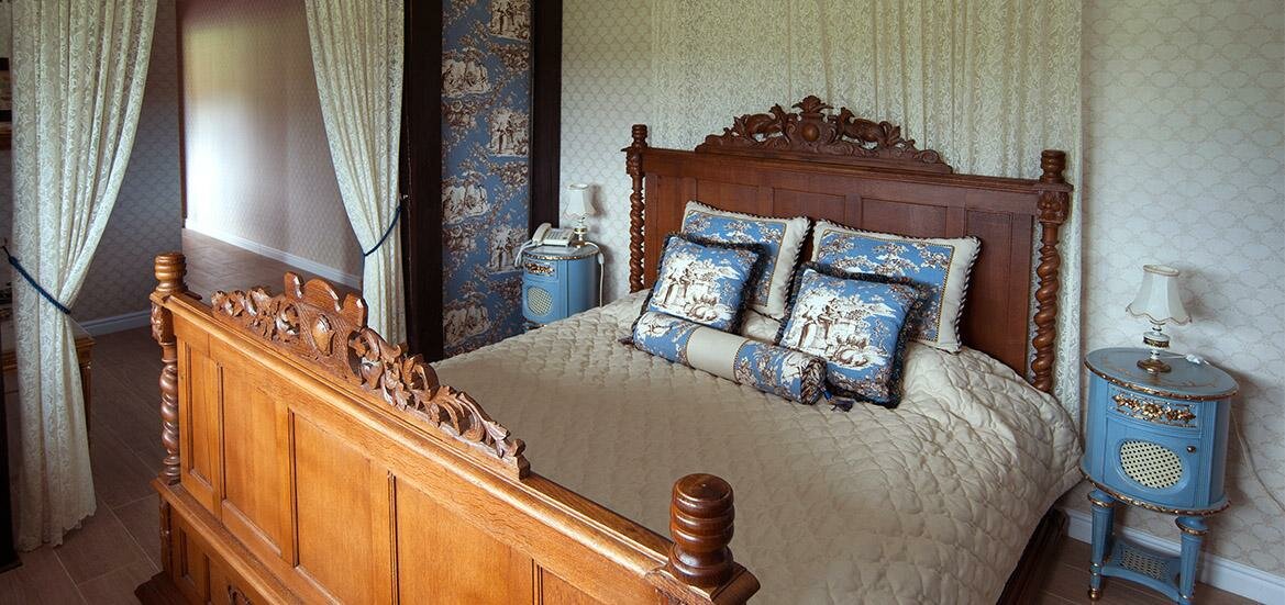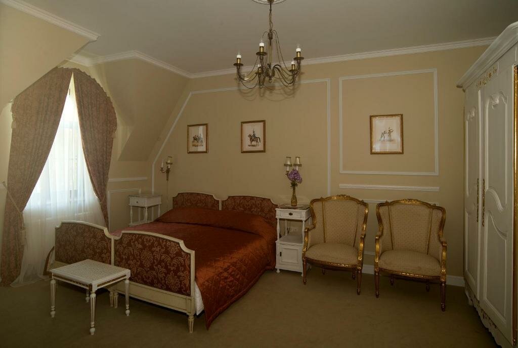 - Вежливый и аккуратный персонал.; Тихое и спокойное место для отдыха.; Антикварная мебель впечатляет.; Есть где погулять, интересно для торжеств.; Качество номеров достойное.