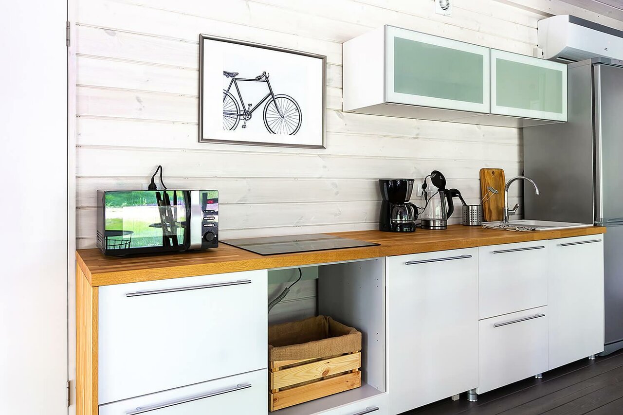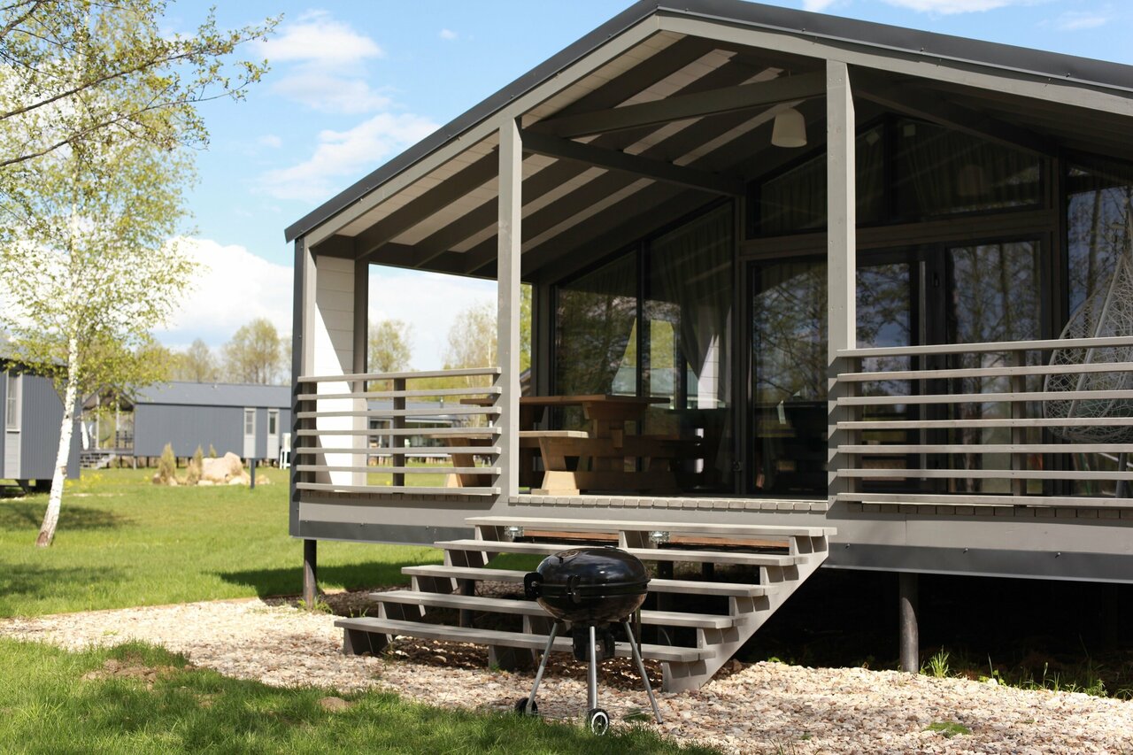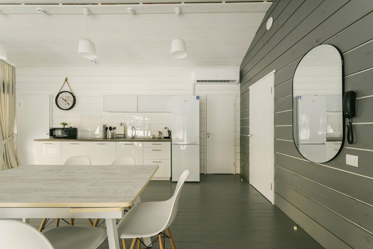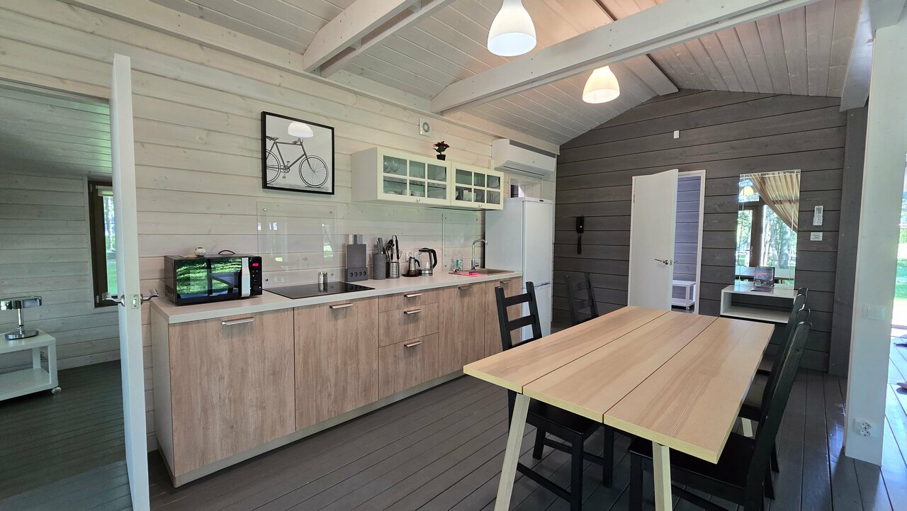 - Полностью оборудованные домики (кухня, техника, мебель).