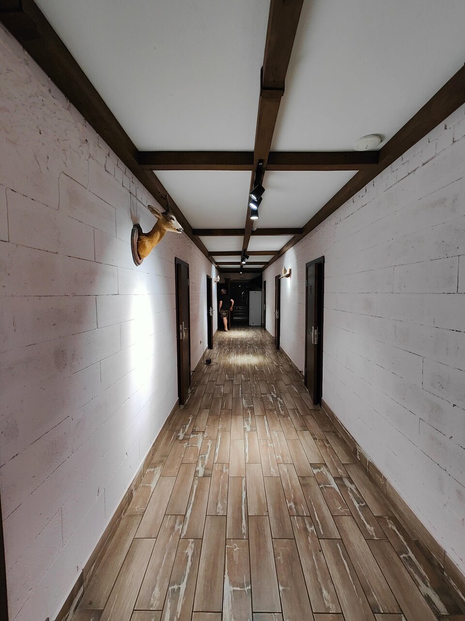 Мне очень понравился отель , недорогой 2500, 2 двуспальные кровати, ты, и ничего лишнего. Душ, туалет, холодильник, микроволновка по коридору. Стены из дерева, коридор с животными. Мило, уютно