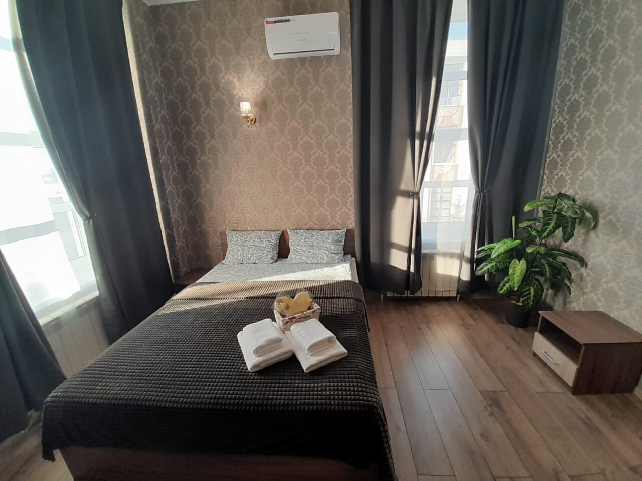 Комфортабельный двуместный номер с кроватью king-size c телевизором, кондиционером, своей ванной комнатой с душевой кабиной.
