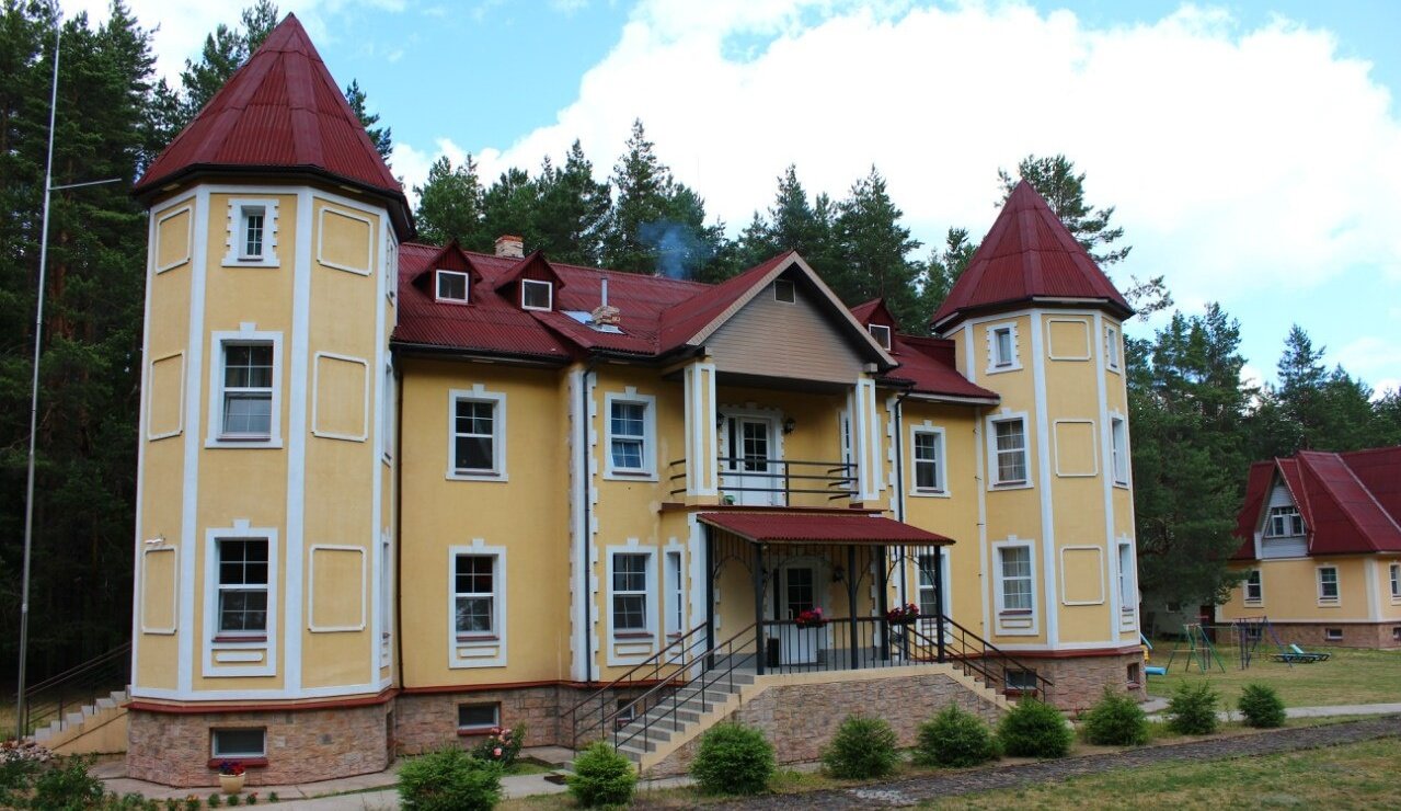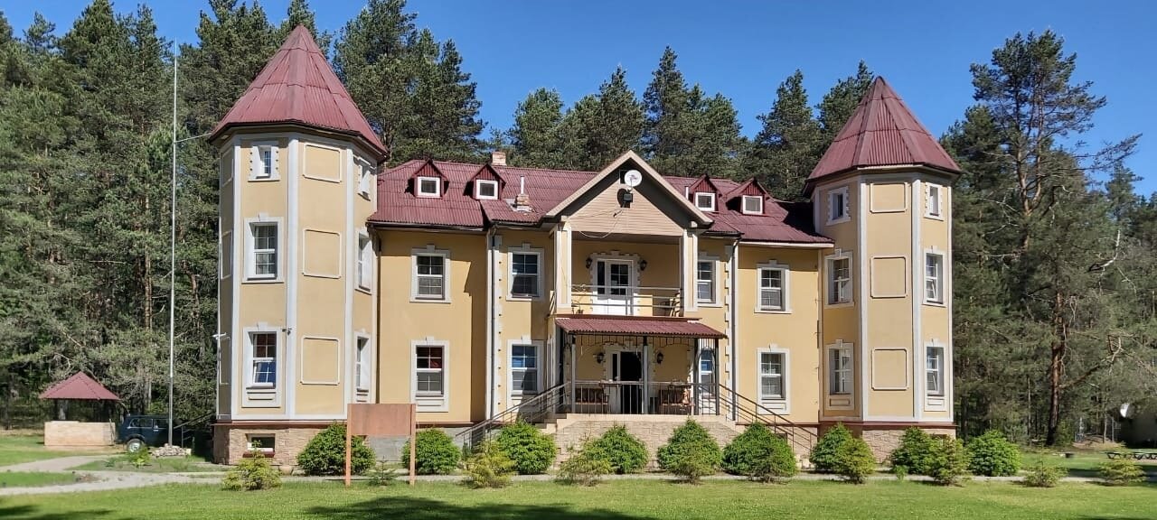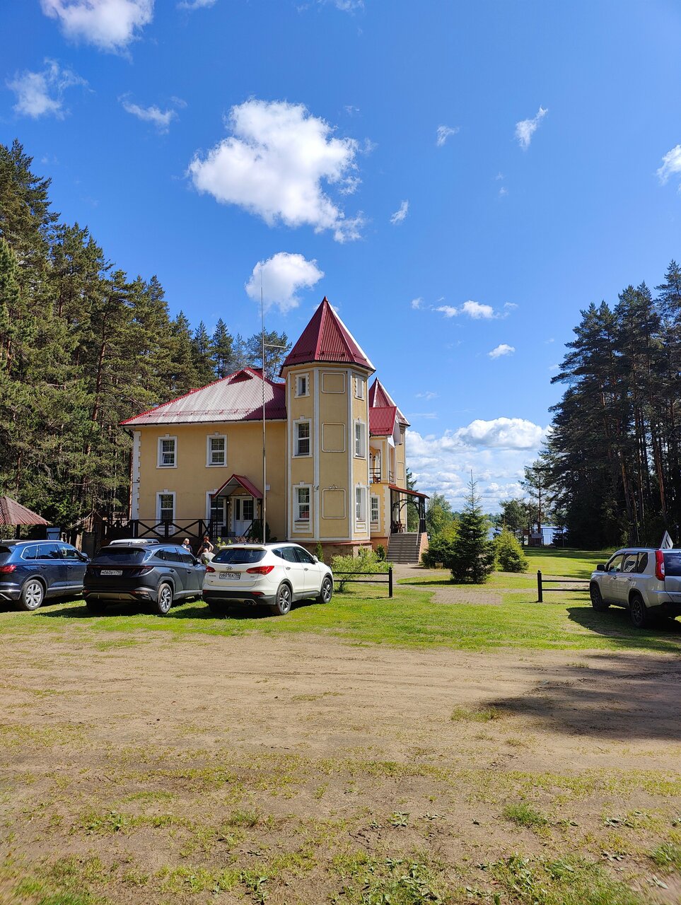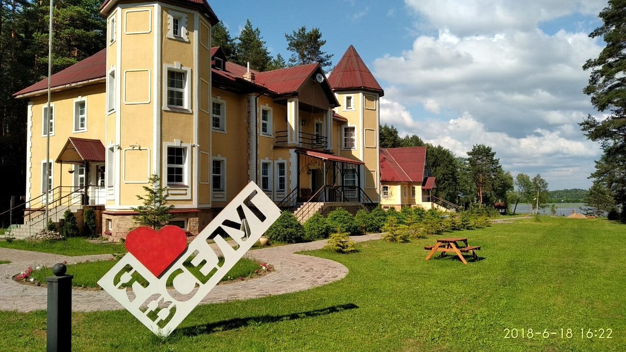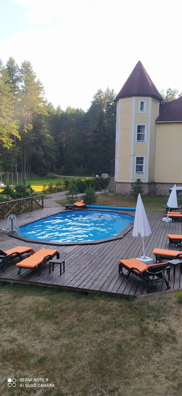 Отдыхали с внуками в июле. Прекрасное место для рыбной ловли, сбора ягод и грибов и для отдыха! Уютное, красивое здание в рыцарском стиле!.. Большой семейный номер на 3-м этаже с двумя спальнями, холодильником и телевизором! Интернет на 3-м этаже не стабильный. Селиться надо на первом или втором этажах. Питание среднее, привередливые дети есть не будут. Советую брать с собой дополнительные продукты и средства против комаров. Есть лодки, катамараны, теннисный и бильярдный столы, беседки для барбекю. Рекомендую для отдыха!..