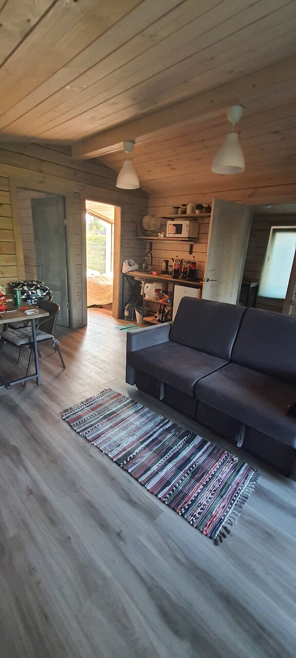 Отличное тихое место для приезда компанией или семьей. Панорамные окна, небольшая территория, камин в домиках, мангалы, большая веранда — все очень уютно и стильно. В домиках две спальни и гостиная, есть вся необходимая посуда. Это про домик Комфорт. Но не более двух дней — дальше будет просто скучно и нечем заняться. Можно с собаками. Кошек опять нельзя. За это минус звезда.