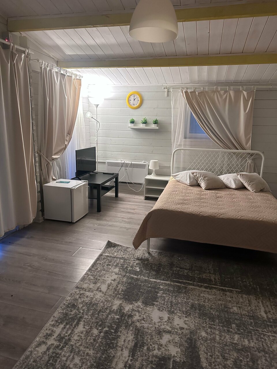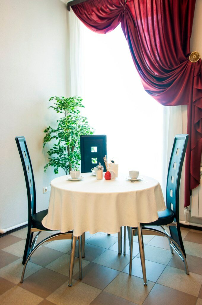 Плюсы: красивый дворик с прудом. Внутри гостиницы есть много живности (птицы, рыбы). На первом этаже Дикси, можно спуститься в магазин через гостиницу. Хороший жёсткий двухспальный матрас. Есть холодильник, сплит. Минусы: попугай начинает чирикать с рассветом (не знаю как летом, у нас начинал чирикать около 7-7.30 утра и замолкает пока не выключат свет, может до 11 вечера чирикать). В душе протекает дверь, когда купаешься, надо следить, чтобы вода не лилась на дверь. Кровать скрипит. Нет большого стола, есть только журнальный. Очень мало розеток (с одной стороны кровати одна и в неё включается иди чайник или светильник, с другой сороны две, одна для светильника, если у вас много устройств, будет не удобно). Без двух светильников в номере темновато. Нет завтраков. В целом для гостиницы за такой ценник и местоположение хорошая.